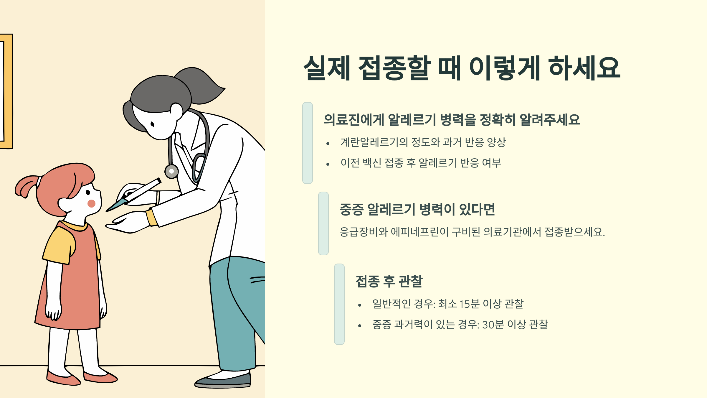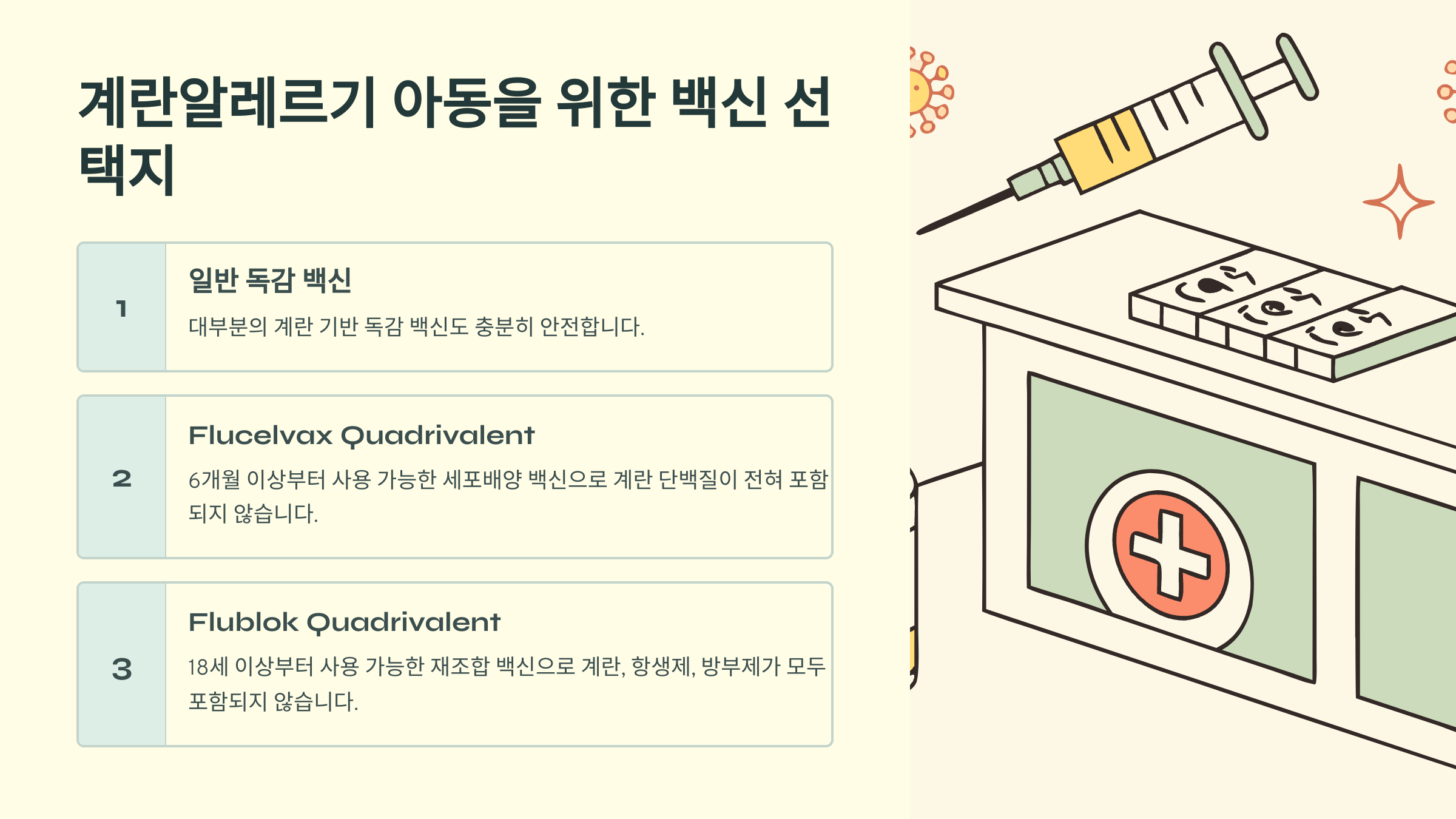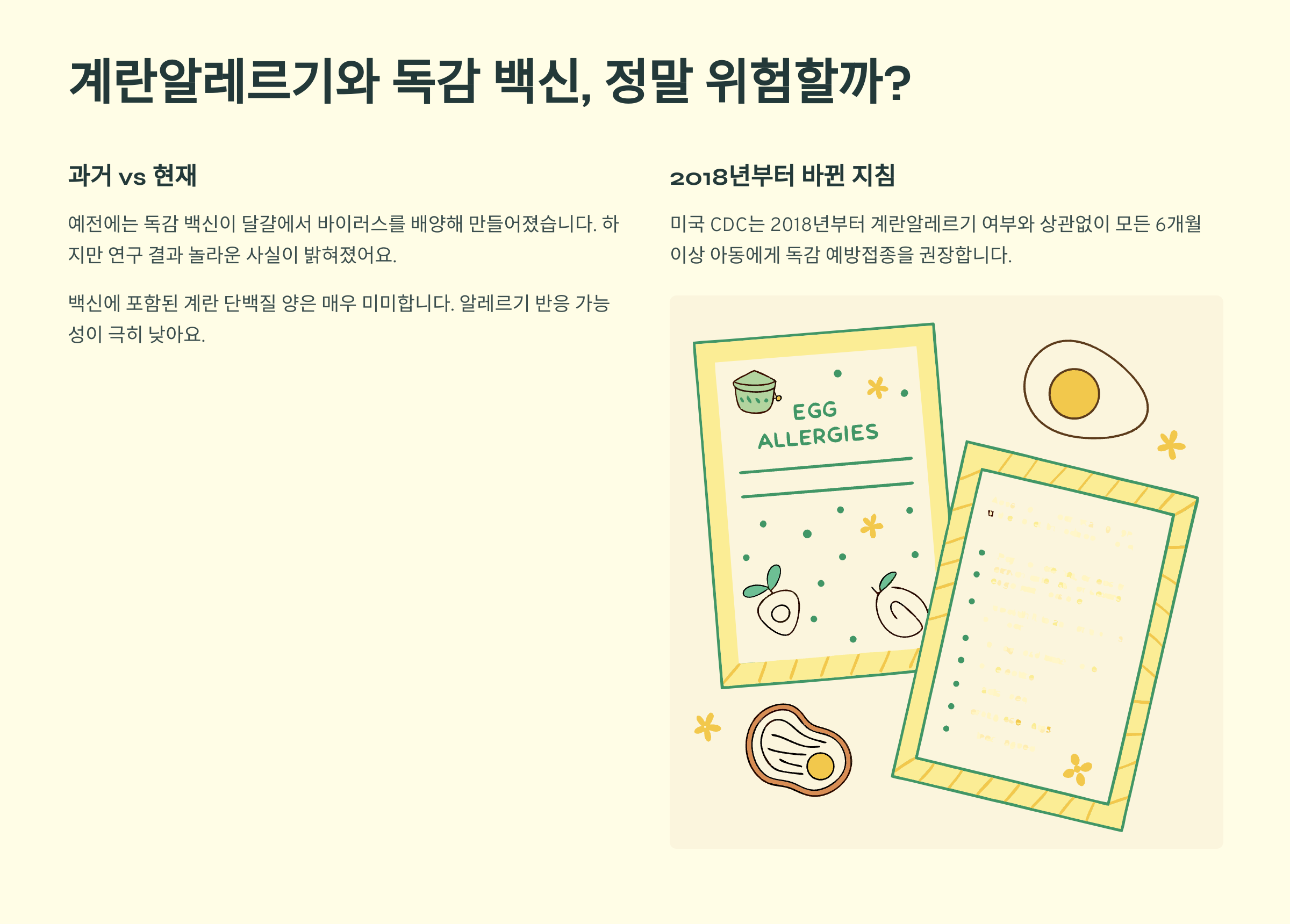 물론 중증 계란알레르기 병력이 있다면 소아청소년과 전문의와 상담 후 적절한 환경에서 안전하게 접종받는 것이 중요해요. 하지만 계란알레르기 자체가 독감 예방접종의 장벽이 되어서는 안 된다는 점, 꼭 기억해 주세요.