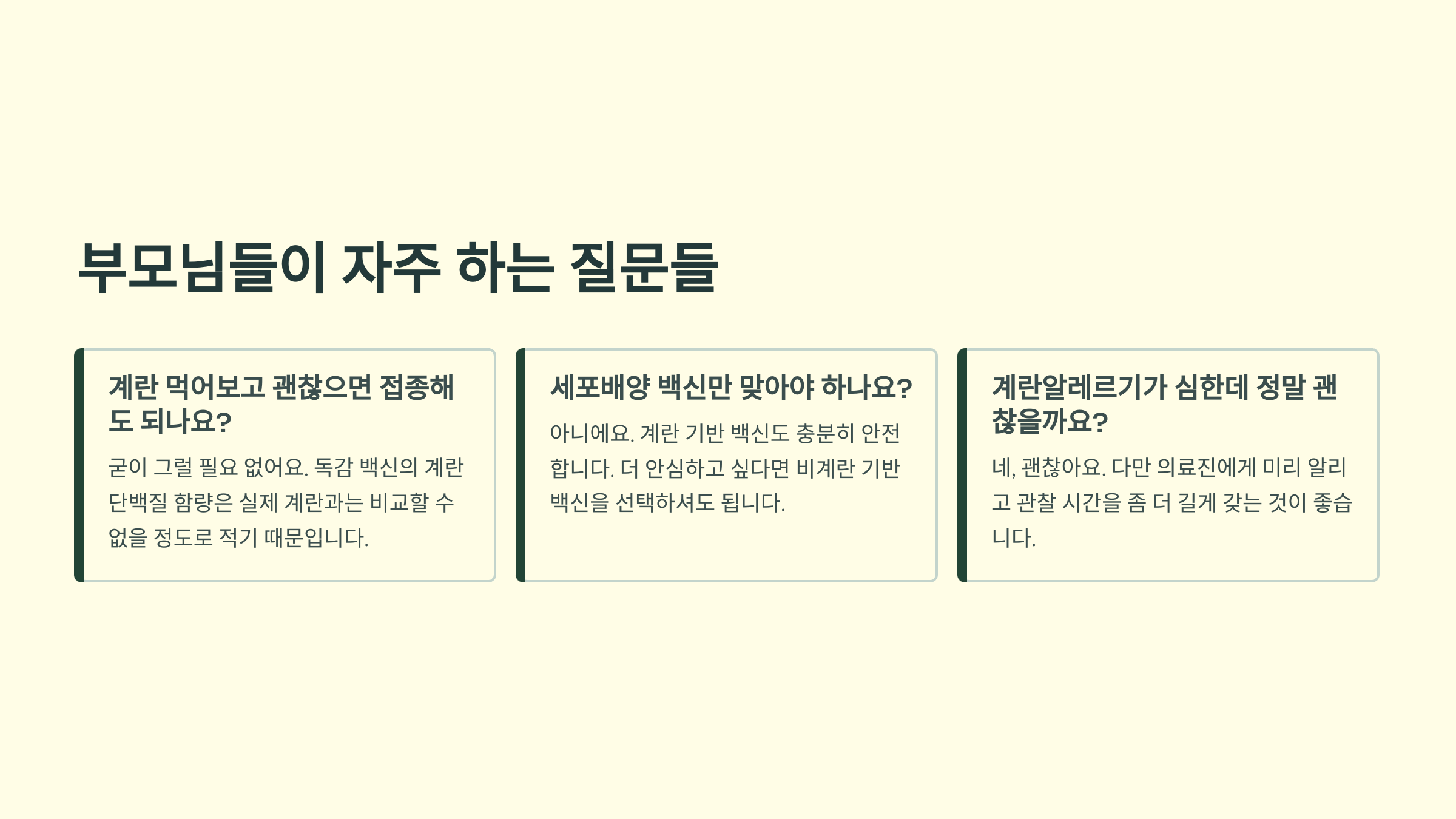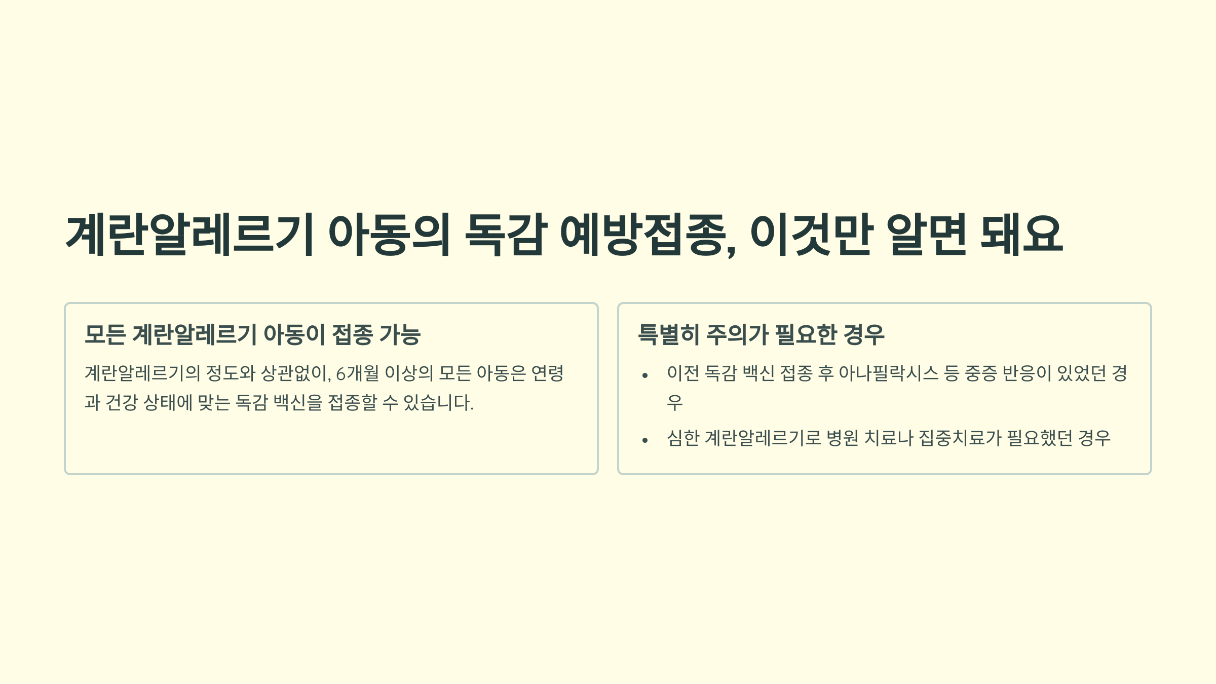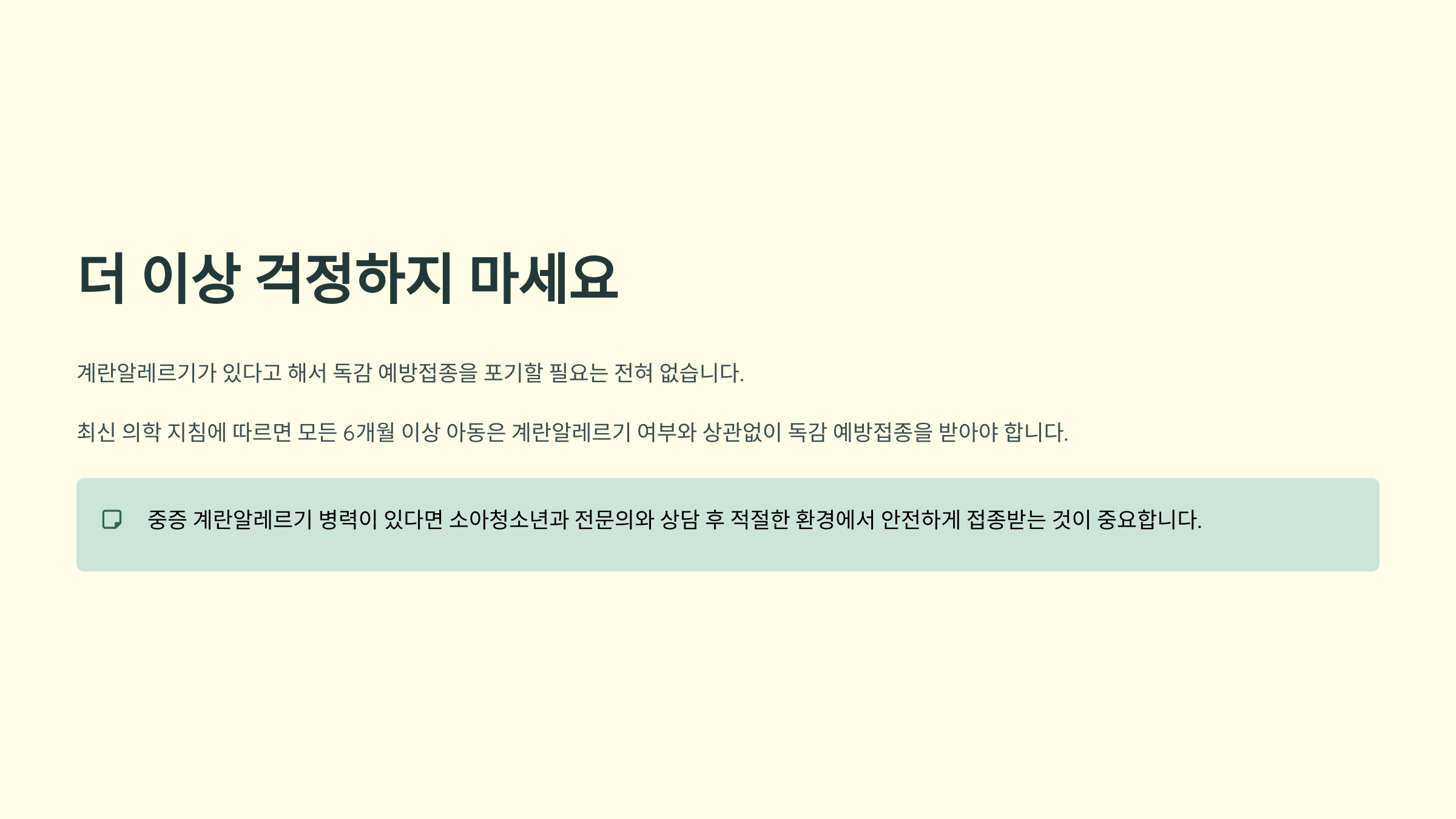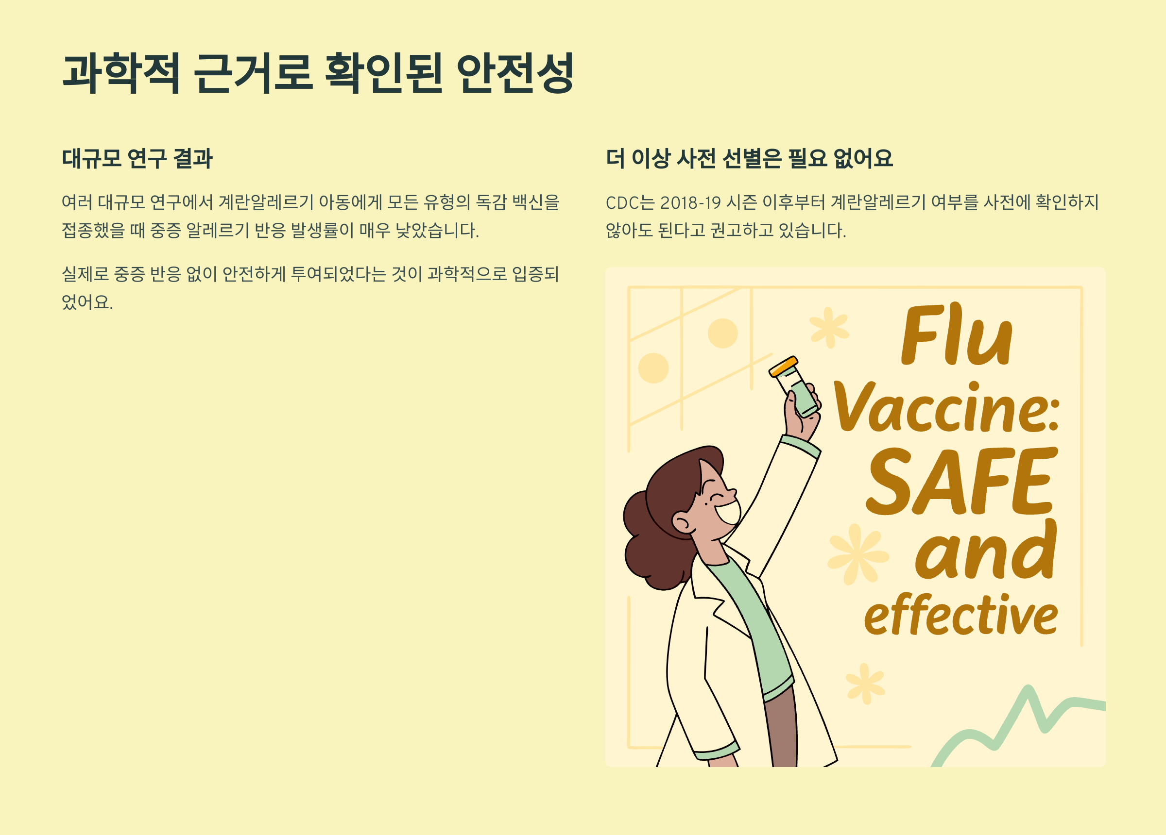 물론 중증 계란알레르기 병력이 있다면 소아청소년과 전문의와 상담 후 적절한 환경에서 안전하게 접종받는 것이 중요해요. 하지만 계란알레르기 자체가 독감 예방접종의 장벽이 되어서는 안 된다는 점, 꼭 기억해 주세요.