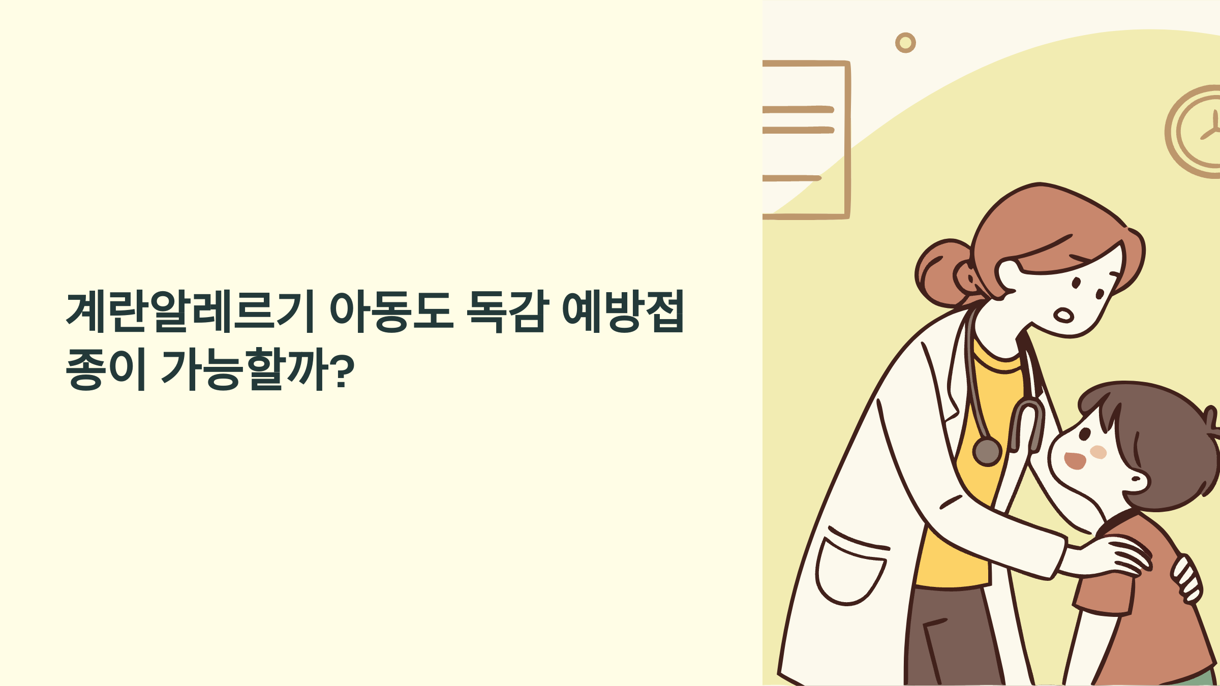 독감은 아이들에게 심각한 합병증을 일으킬 수 있는 질병이에요. 예방접종으로 충분히 막을 수 있는 질병을 놓치지 마시고, 계란알레르기 때문에 망설이고 계셨다면 이제 안심하고 접종받으세요.