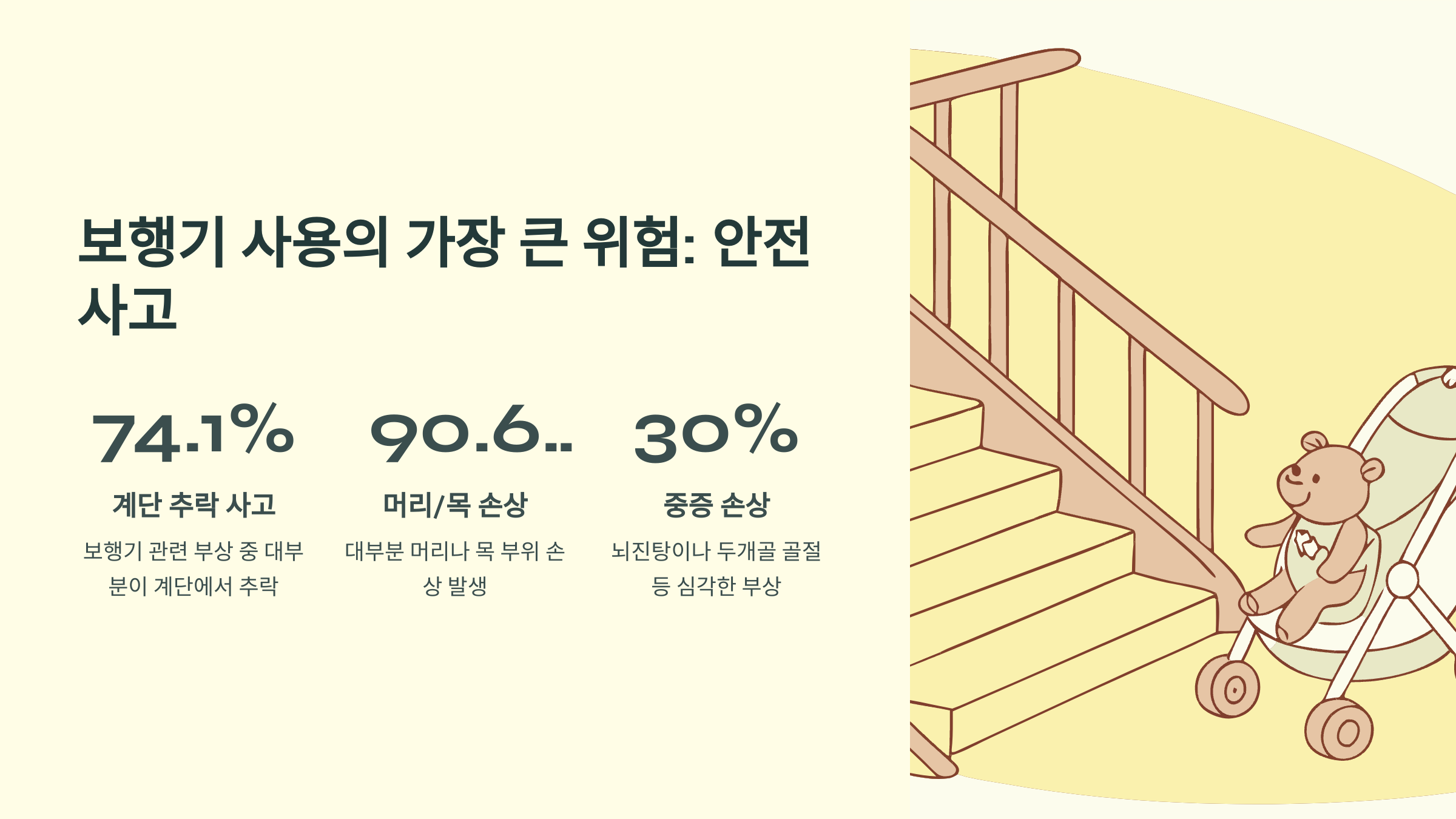 미국 응급실 데이터를 분석한 결과, 보행기 관련 부상 중 **74.1%**가 계단에서의 추락 때문이었어요. 정말 무서운 통계죠.