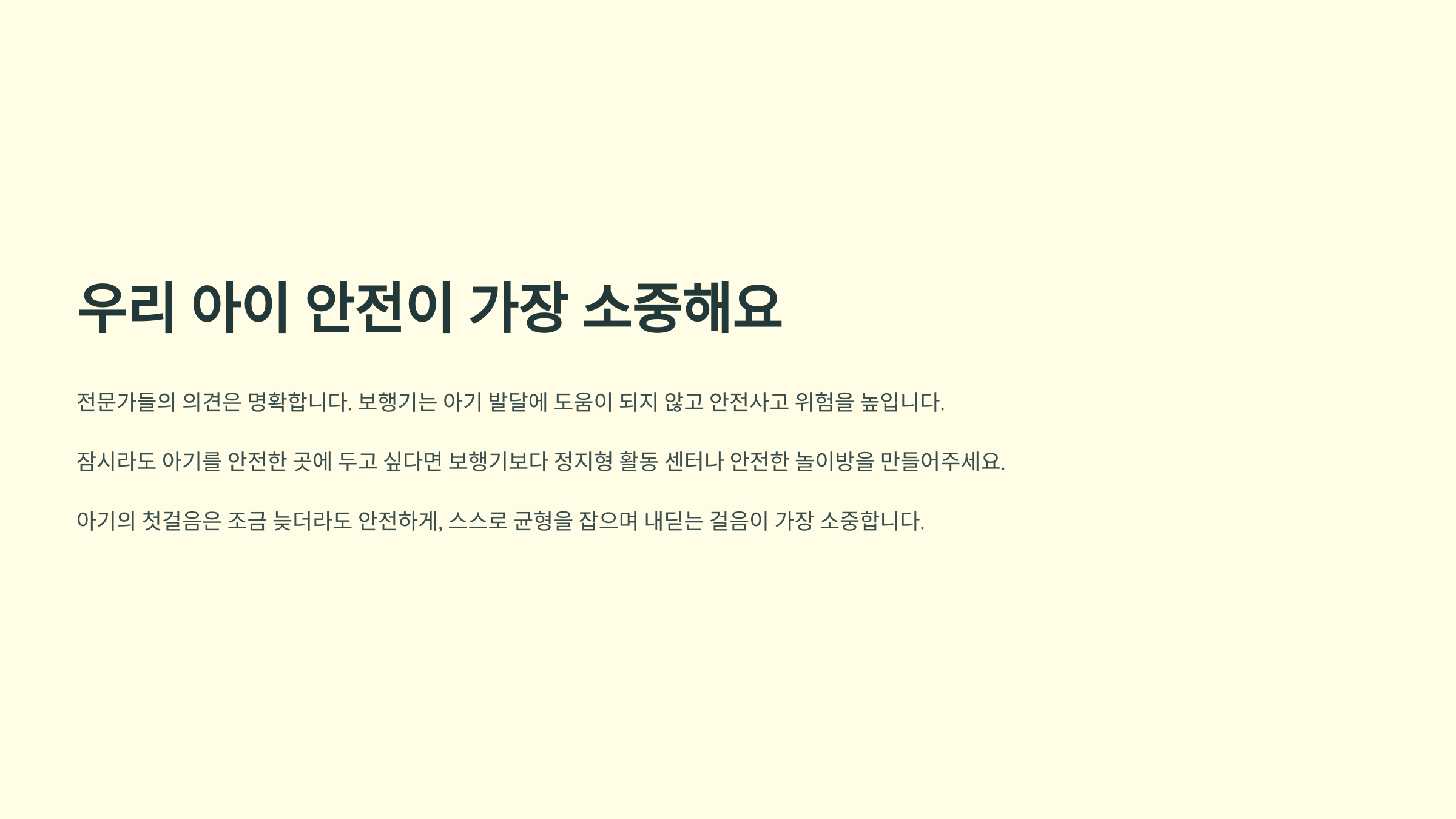 우리 아이가 건강하게 자연스럽게 성장할 수 있도록, 조금 불편하더라도 안전을 우선으로 선택하는 현명한 부모가 되어주세요. 아기의 첫걸음은 조금 늦더라도 안전하게, 그리고 스스로 균형을 잡으며 내딛는 걸음이 가장 소중하니까요.