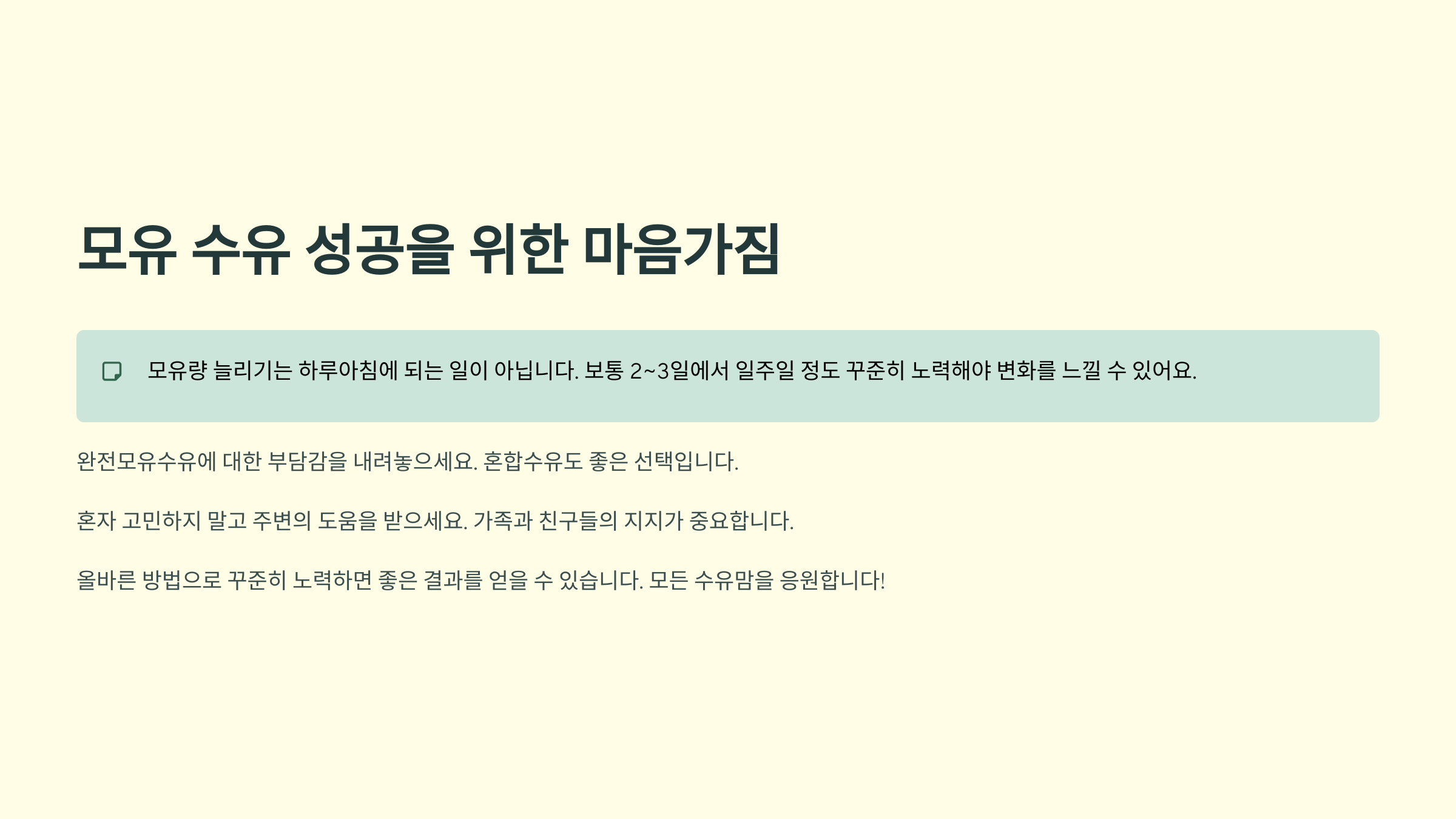모유량을 늘리는 것은 충분히 가능한 일이에요. 올바른 방법으로 꾸준히 노력하면 분명 좋은 결과를 얻을 수 있을 거라 믿어요. 모든 수유맘들을 응원합니다!