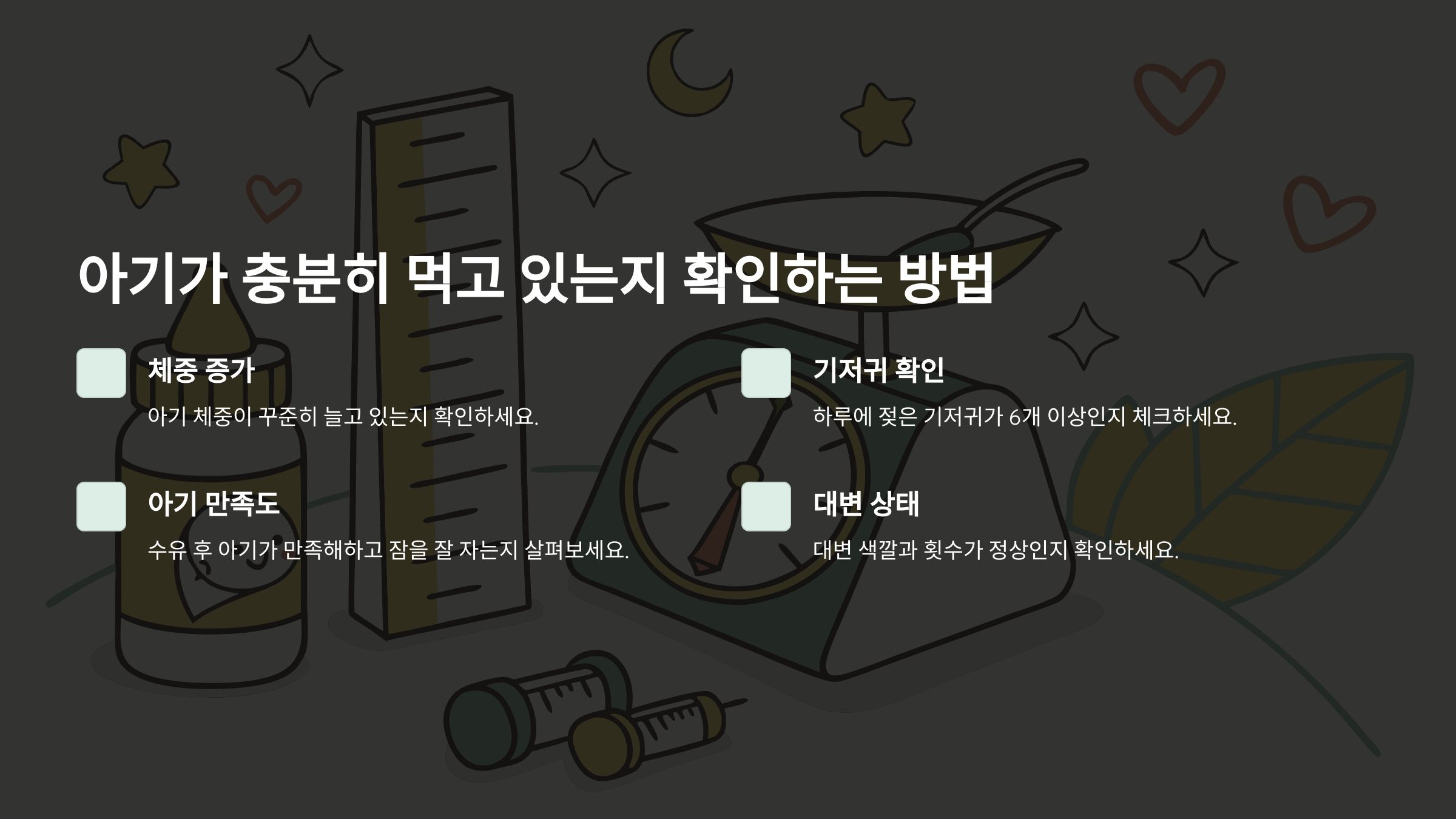 - 아기가 수유 후 만족해하고 잠을 잘 자는지