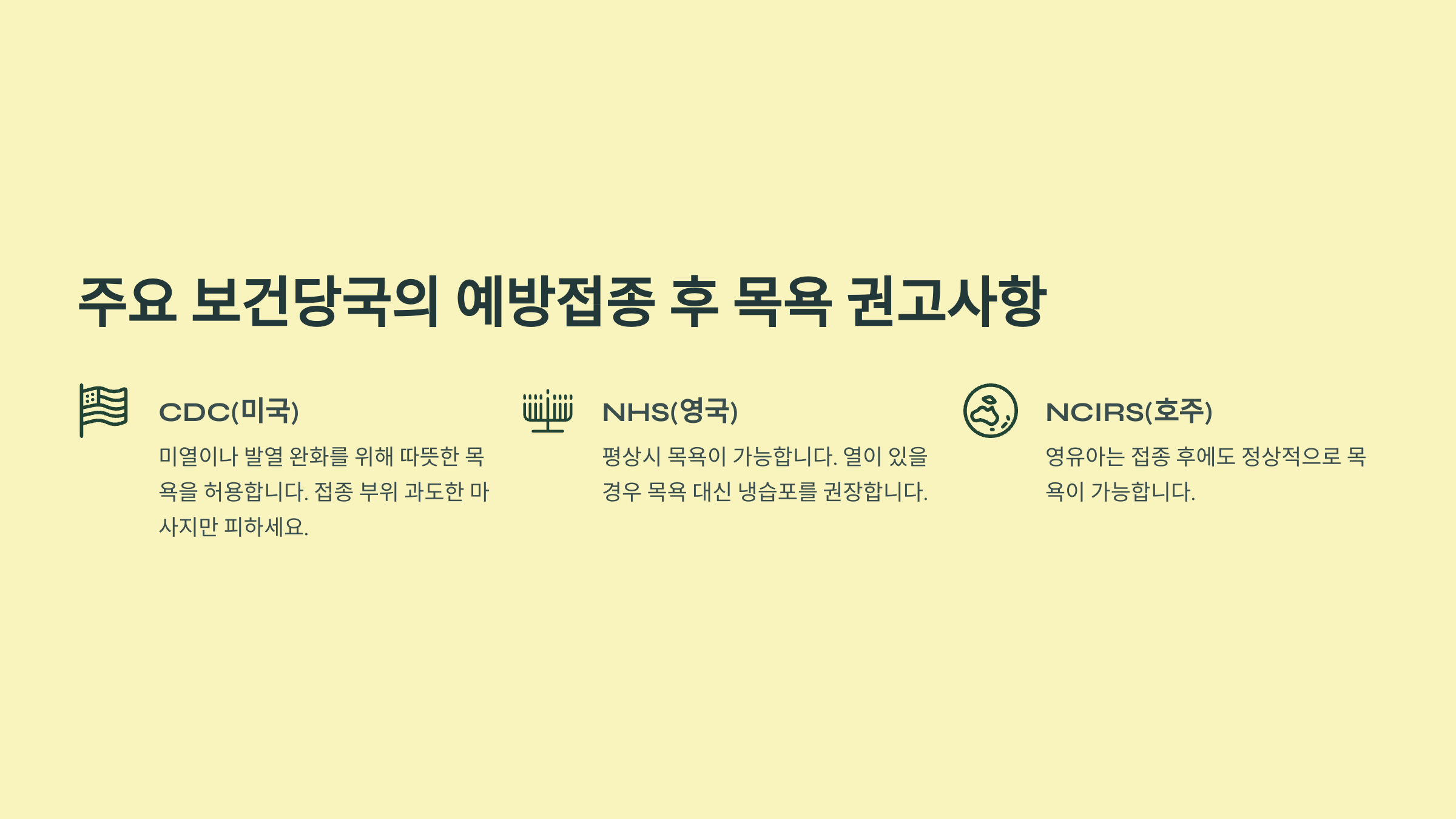 주요 보건당국의 예방접종 후 목욕 권고사항