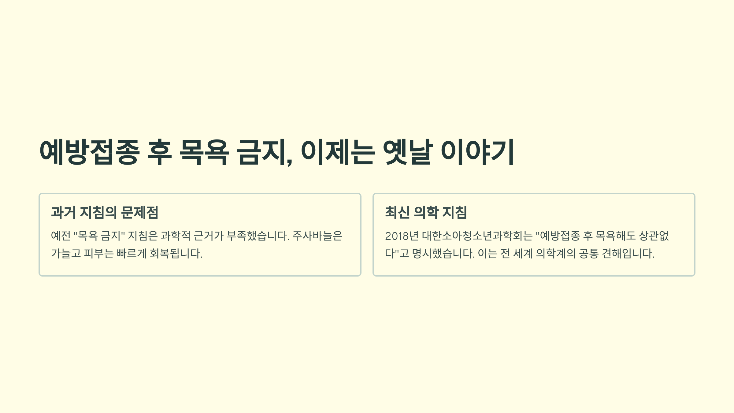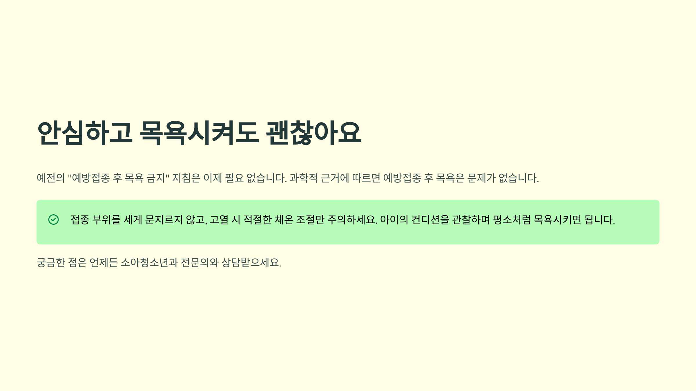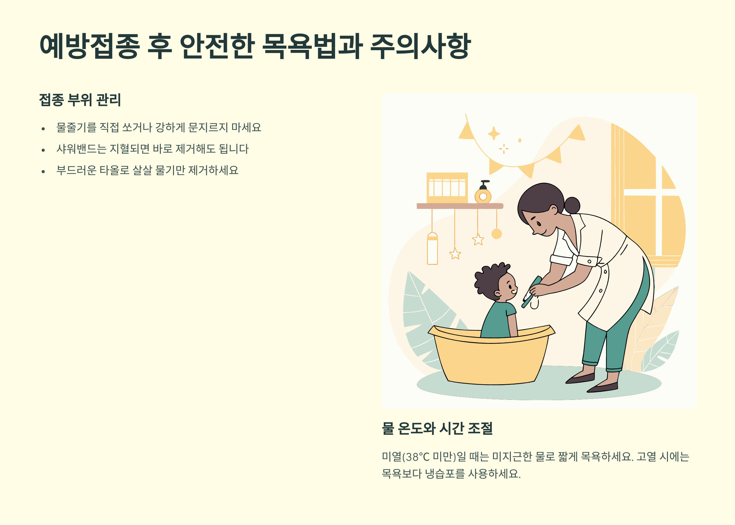 예전에는 "예방접종 후 목욕 금지"라는 말 때문에 많은 부모님들이 걱정했지만, 이제는 그럴 필요가 없어요. 과학적 근거에 바탕한 최신 의학 지침에 따르면 예방접종 후 목욕은 전혀 문제가 되지 않습니다.