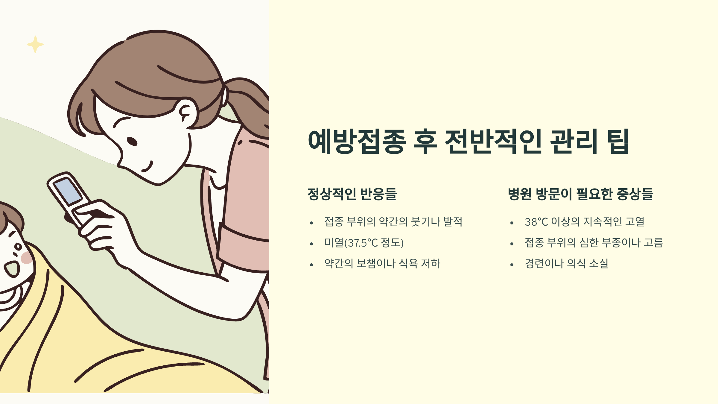 예방접종은 우리 아이를 질병으로부터 보호하는 중요한 의료행위예요. 올바른 정보를 바탕으로 안심하고 관리해주시길 바라며, 궁금한 점이 있으시면 언제든 소아청소년과 전문의와 상담받으시기 바랍니다.