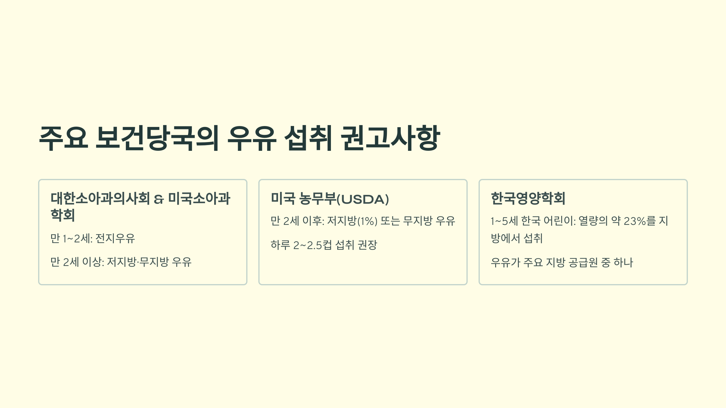 연구 결과들이 조금씩 다르긴 하지만, 전 세계 보건당국들이 공통으로 권장하는 가이드라인은 분명해요. 만 2세 이후부터는 저지방 우유로 전환하라는 것이죠. 이는 단순히 비만 예방만을 위한 것이 아니라, 장기적인 심혈관 건강과 성인병 예방을 위한 선택이에요.