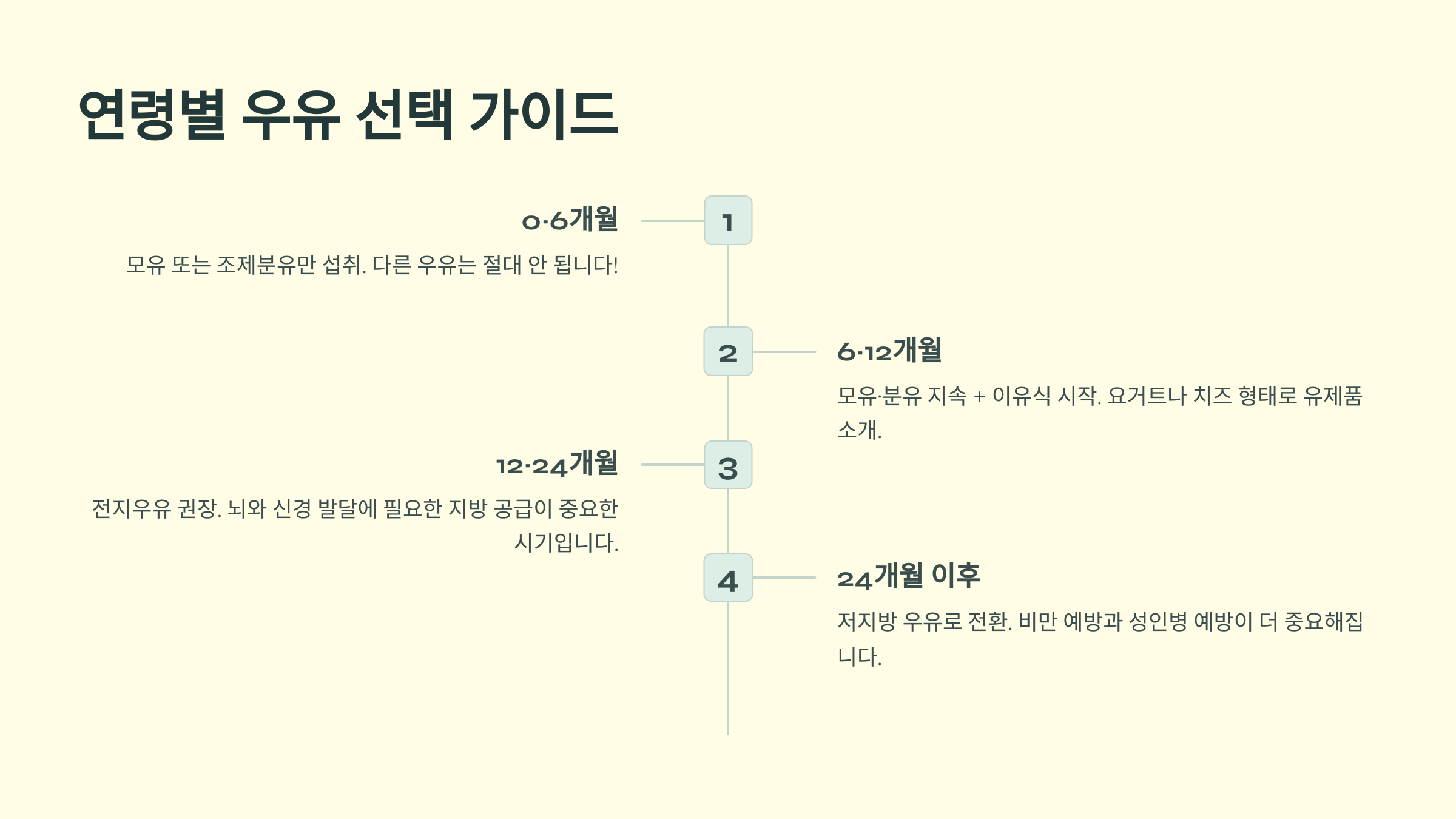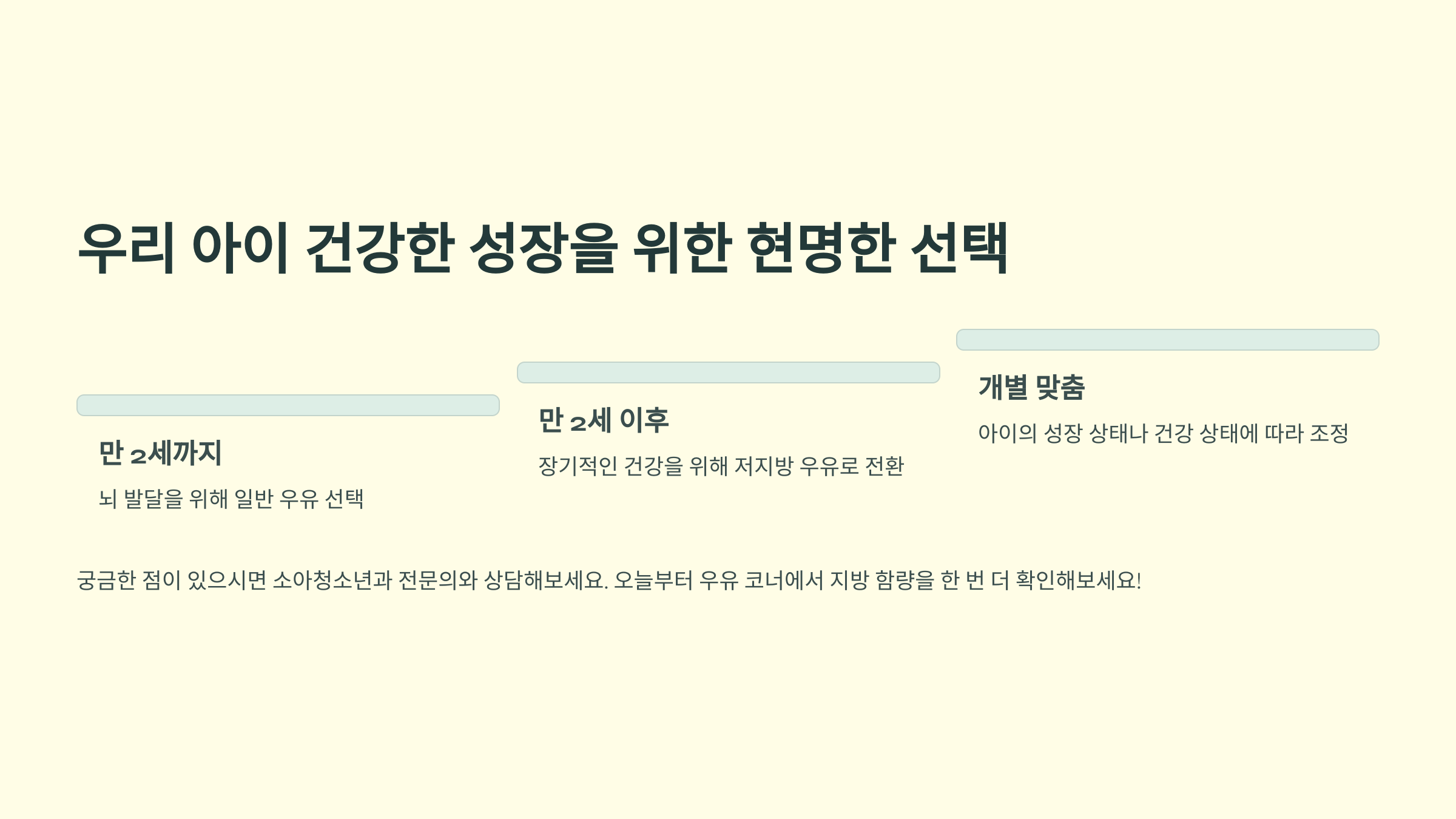 결국 정리해보면 이래요. 만 2세까지는 뇌 발달을 위해 일반 우유를, 그 이후부터는 장기적인 건강을 위해 저지방 우유를 선택하는 것이 가장 현명한 방법이에요.