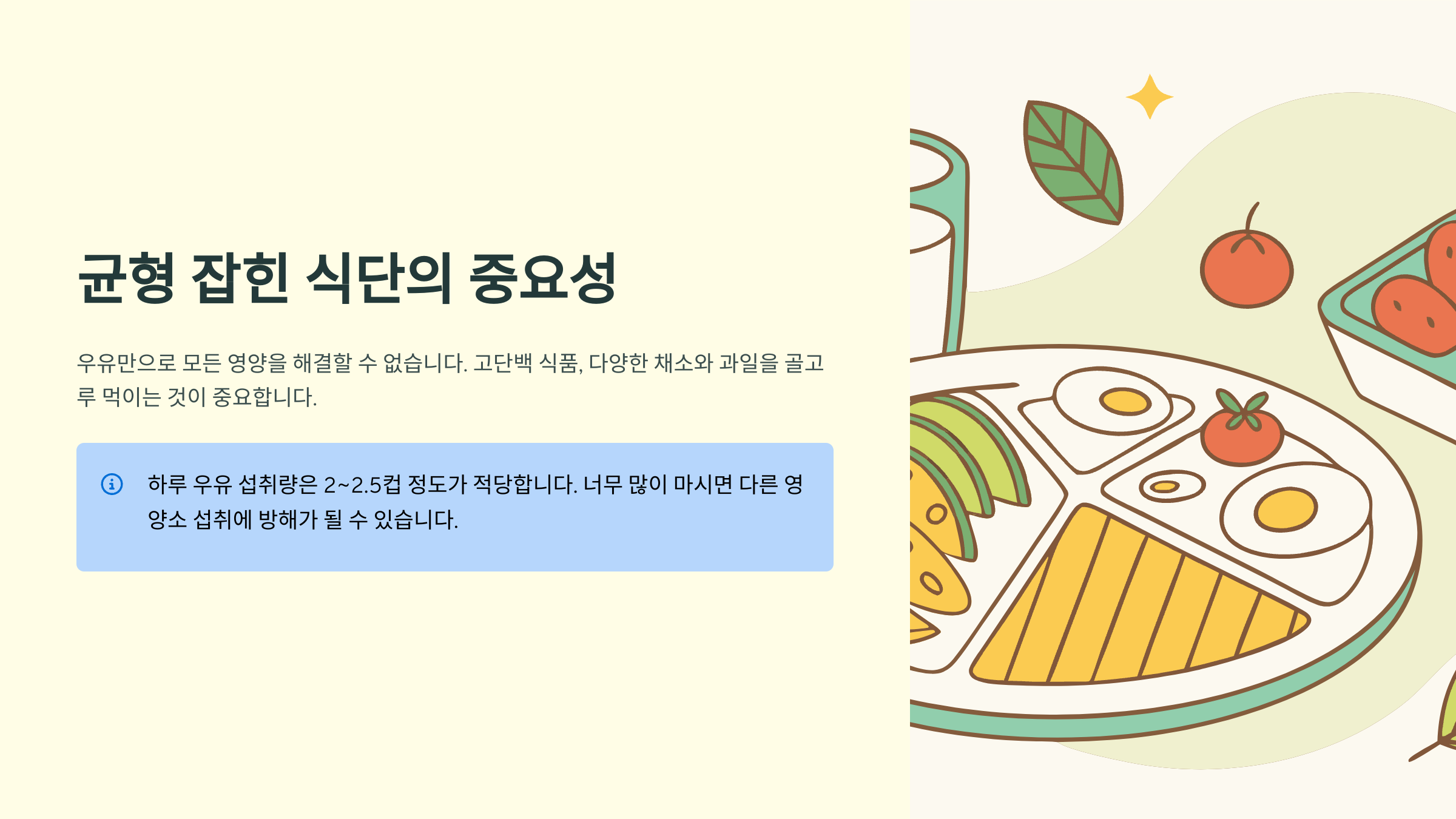 우유만으로 모든 영양을 해결할 수는 없어요. 고단백 식품인 달걀, 생선, 콩류와 함께 다양한 채소와 과일을 골고루 먹이는 것이 중요해요. 우유는 전체 식단의 한 부분이라는 걸 잊지 마세요.