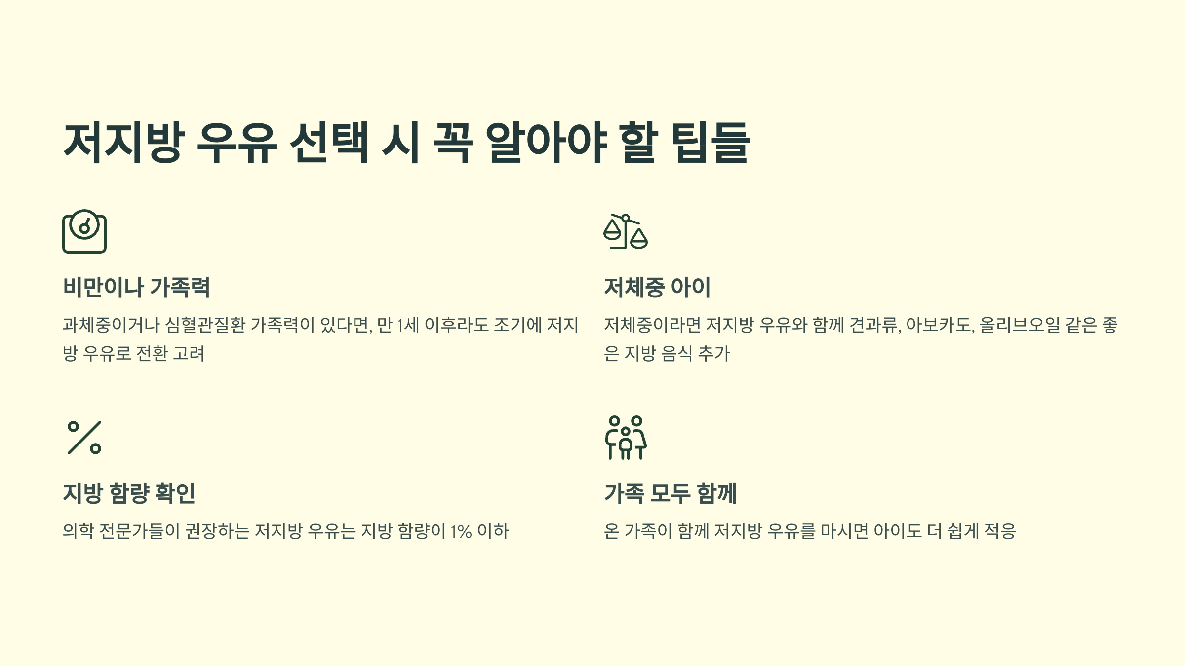 만약 아이가 과체중이거나 가족 중에 심혈관질환 병력이 있다면, 만 1세 이후라도 조기에 저지방 우유로 전환하는 것을 고려해볼 수 있어요.