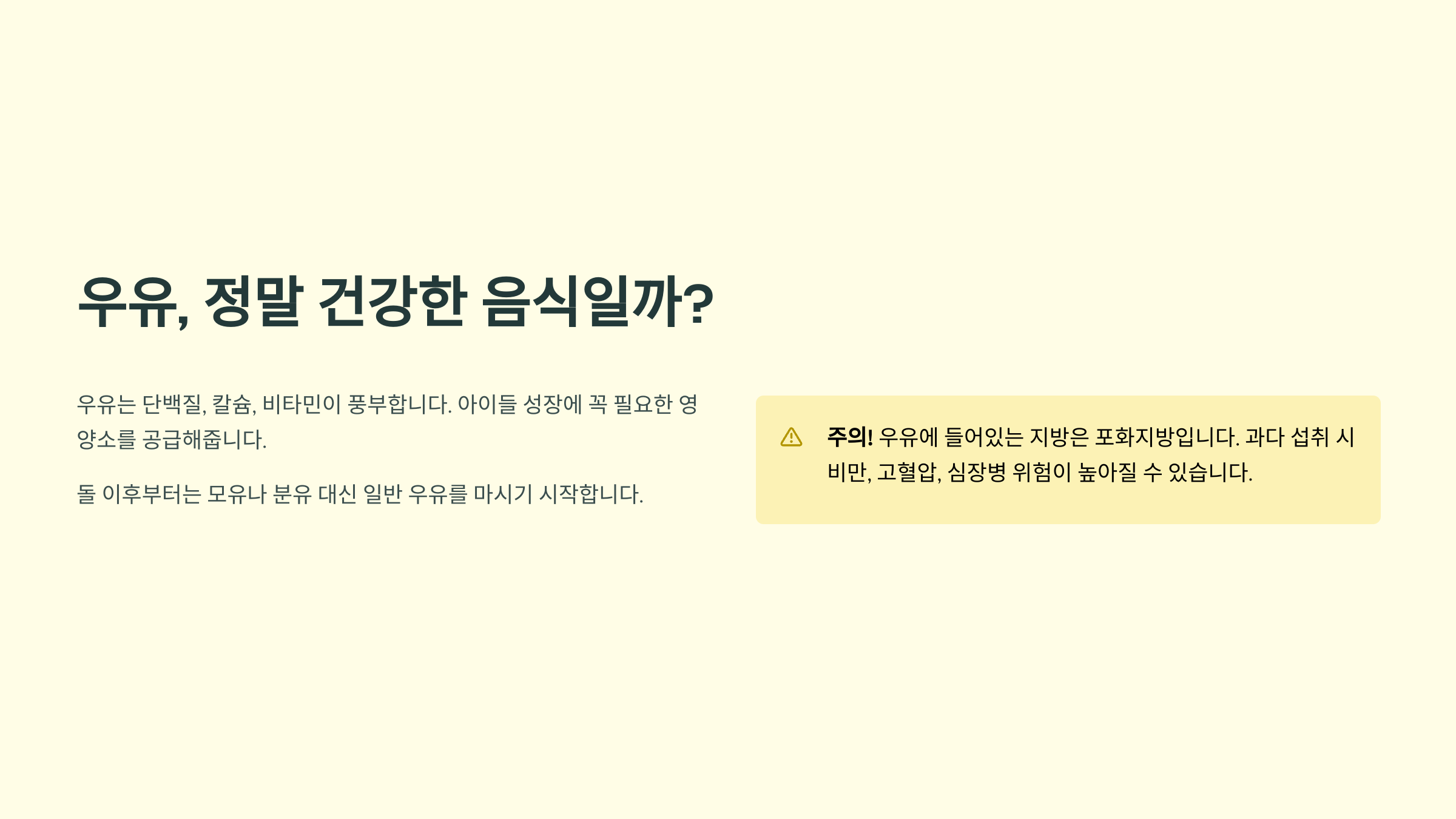 우유는 단백질, 칼슘, 비타민 등이 풍부해서 아이들 성장에 꼭 필요한 영양소를 공급해주는 고마운 식품이에요. 돌 이후부터는 모유나 분유 대신 일반 우유를 마시기 시작하죠. 하루에 1~2컵 정도의 우유는 건강한 성장에 정말 도움이 됩니다.