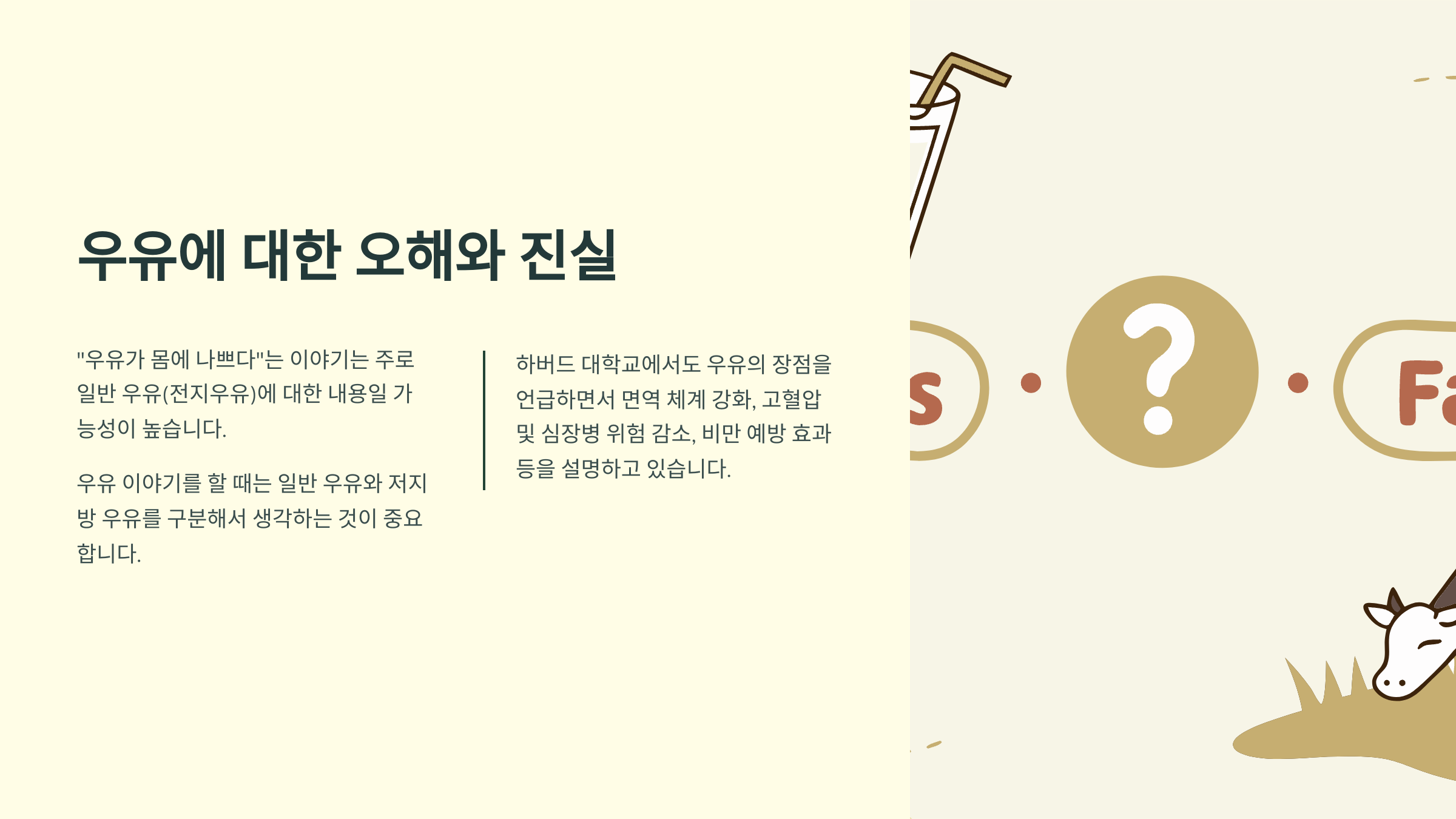 인터넷에서 "우유가 몸에 나쁘다"는 이야기를 본 적 있으실 거예요. 하지만 이런 이야기들은 주로 일반 우유(전지우유)에 대한 내용일 가능성이 높아요.