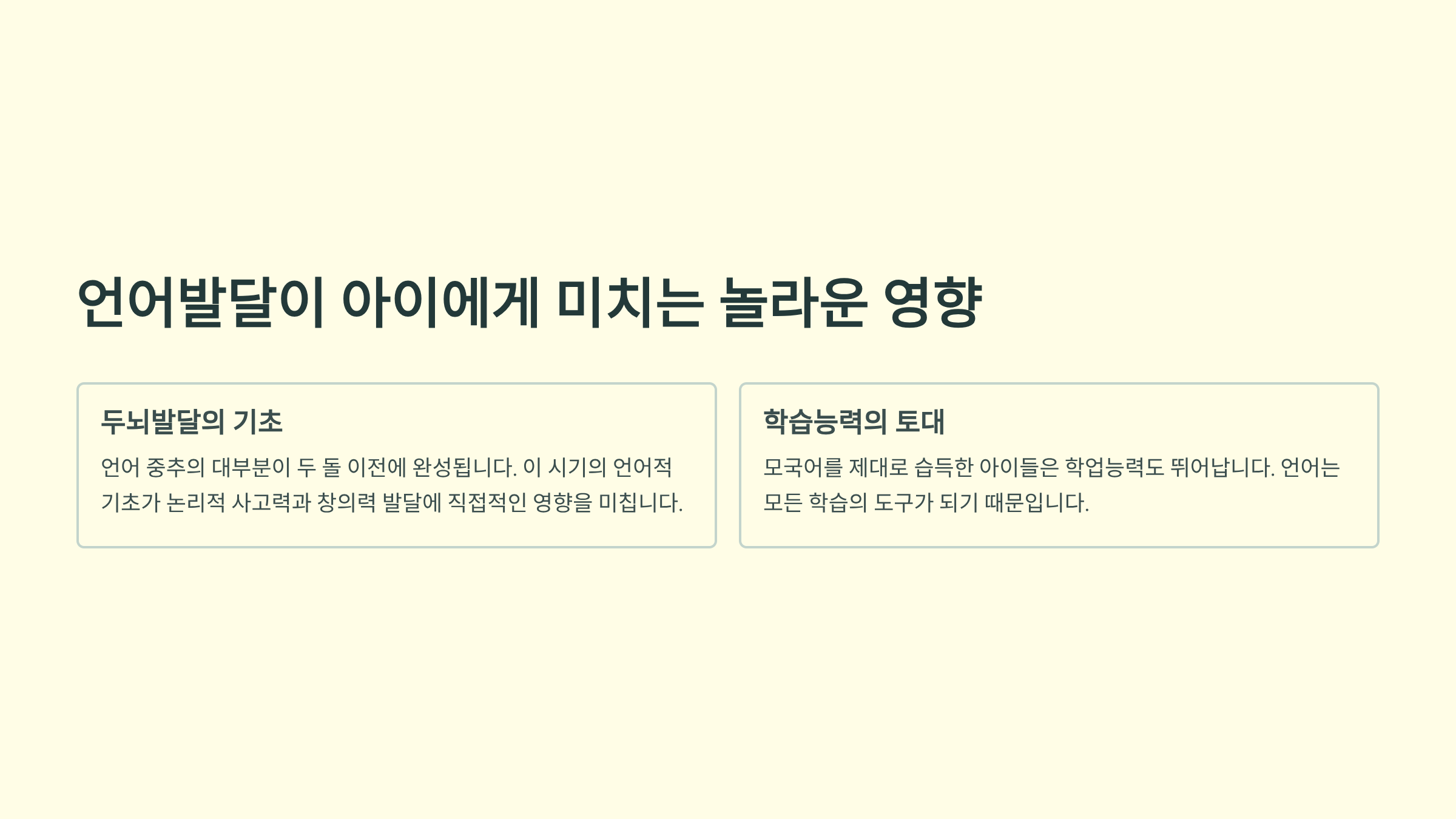 언어발달은 단순히 말을 잘하게 되는 것 이상의 의미가 있어요. 아이의 평생 두뇌발달과 학습능력의 기초가 되거든요.