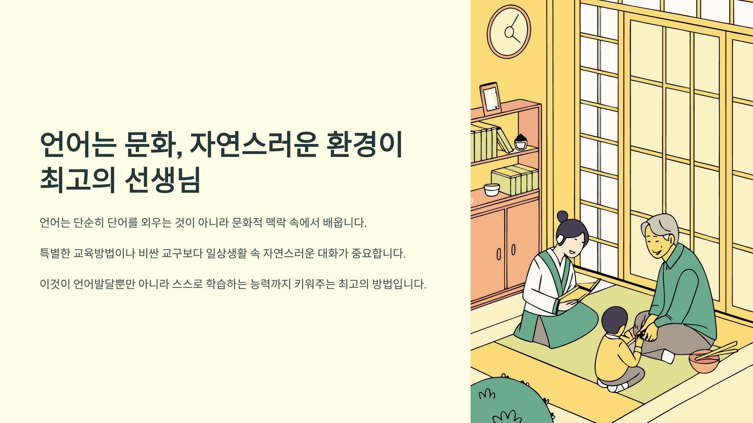 언어는 단순히 단어를 외우는 것이 아니라 문화적 맥락 속에서 배우는 거예요. 아이에게 풍부한 언어적 환경을 제공한다는 것은 곧 우리의 문화를 경험하게 해주는 것과 같아요.