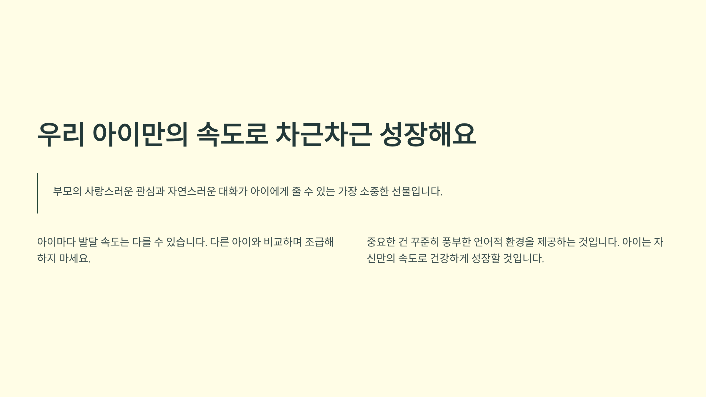 중요한 건 꾸준히 풍부한 언어적 환경을 제공해주는 거예요. 그러면 아이는 자신만의 속도로 건강하게 언어를 습득해나갈 거예요.