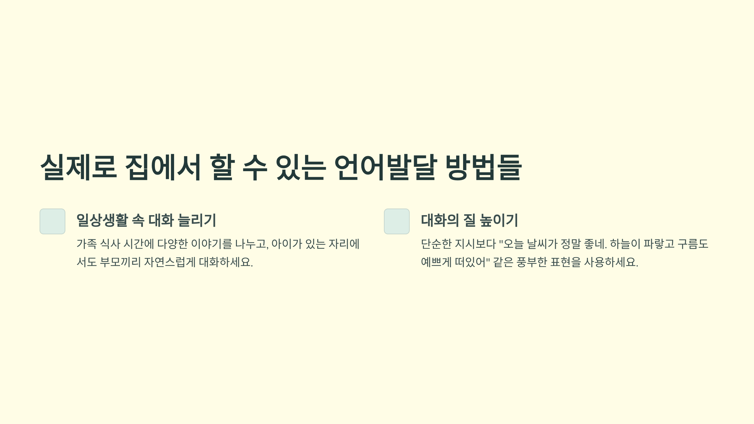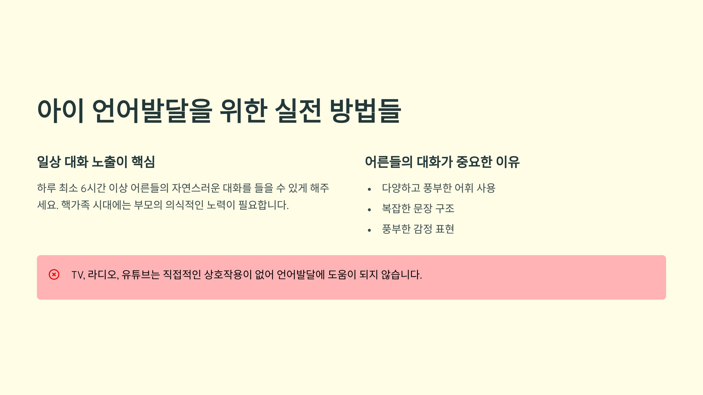 그렇다면 구체적으로 어떻게 해야 아이의 언어발달을 도와줄 수 있을까요? 전문의 선생님이 강조하신 핵심 포인트들을 정리해드릴게요.