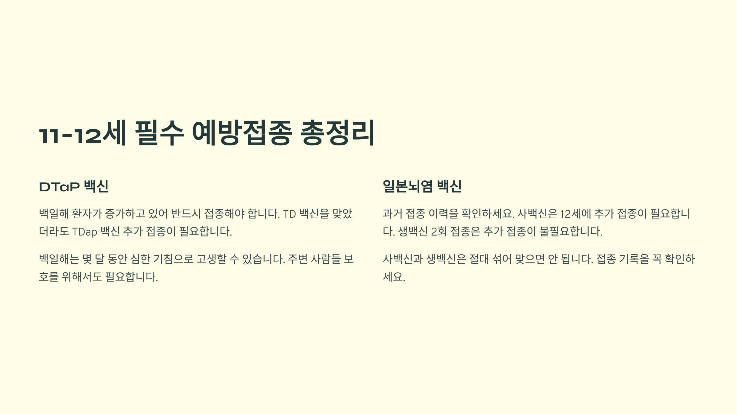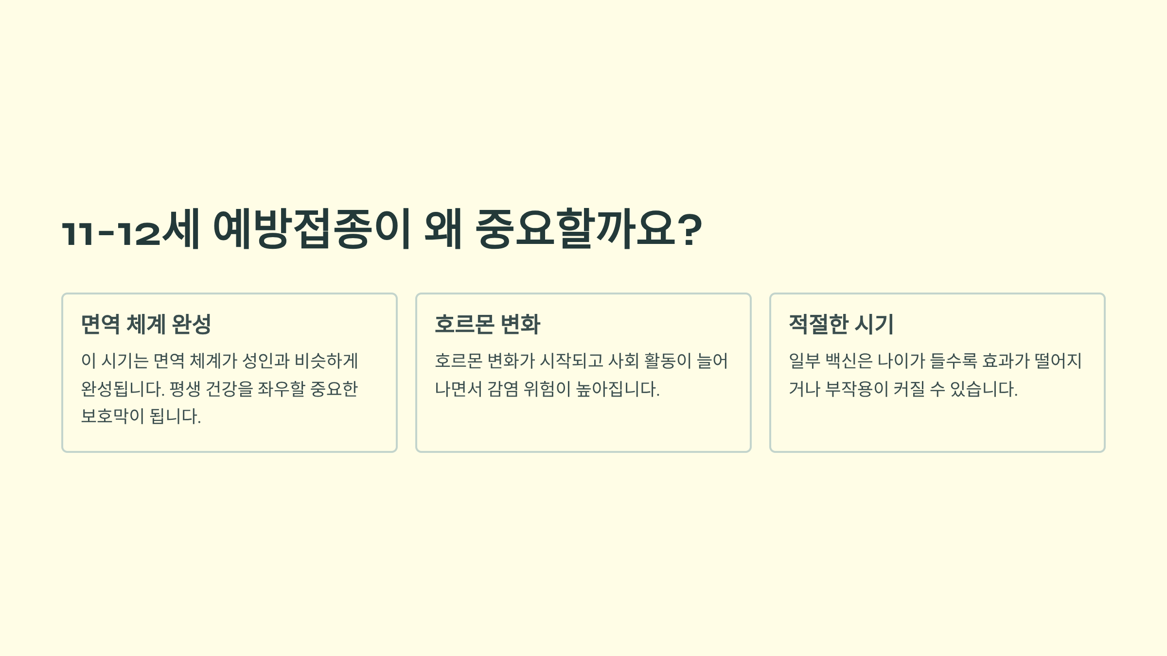 11-12세는 아이들의 면역 체계가 성인과 비슷하게 완성되어 가는 시기예요. 이때 받는 예방접종은 단순히 어린 시절 받았던 백신의 연장선이 아니라, 평생 건강을 좌우할 수 있는 정말 중요한 보호막이 되어준답니다.