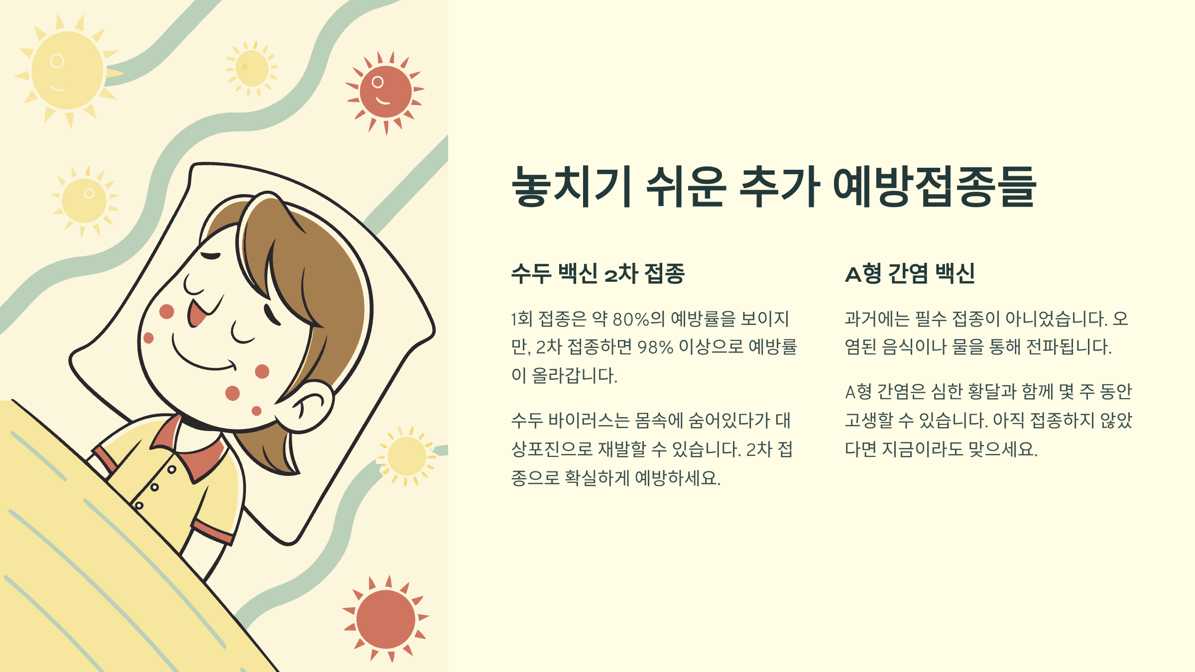 "우리 아이는 이미 수두 백신을 맞았는데 왜 또 맞아야 하나요?"라고 생각하실 수 있어요. 하지만 수두 바이러스는 한 번 감염되면 몸속에 숨어있다가 나중에 대상포진으로 재발할 수 있어요. 2차 접종으로 더 확실하게 예방하는 것이 좋답니다.