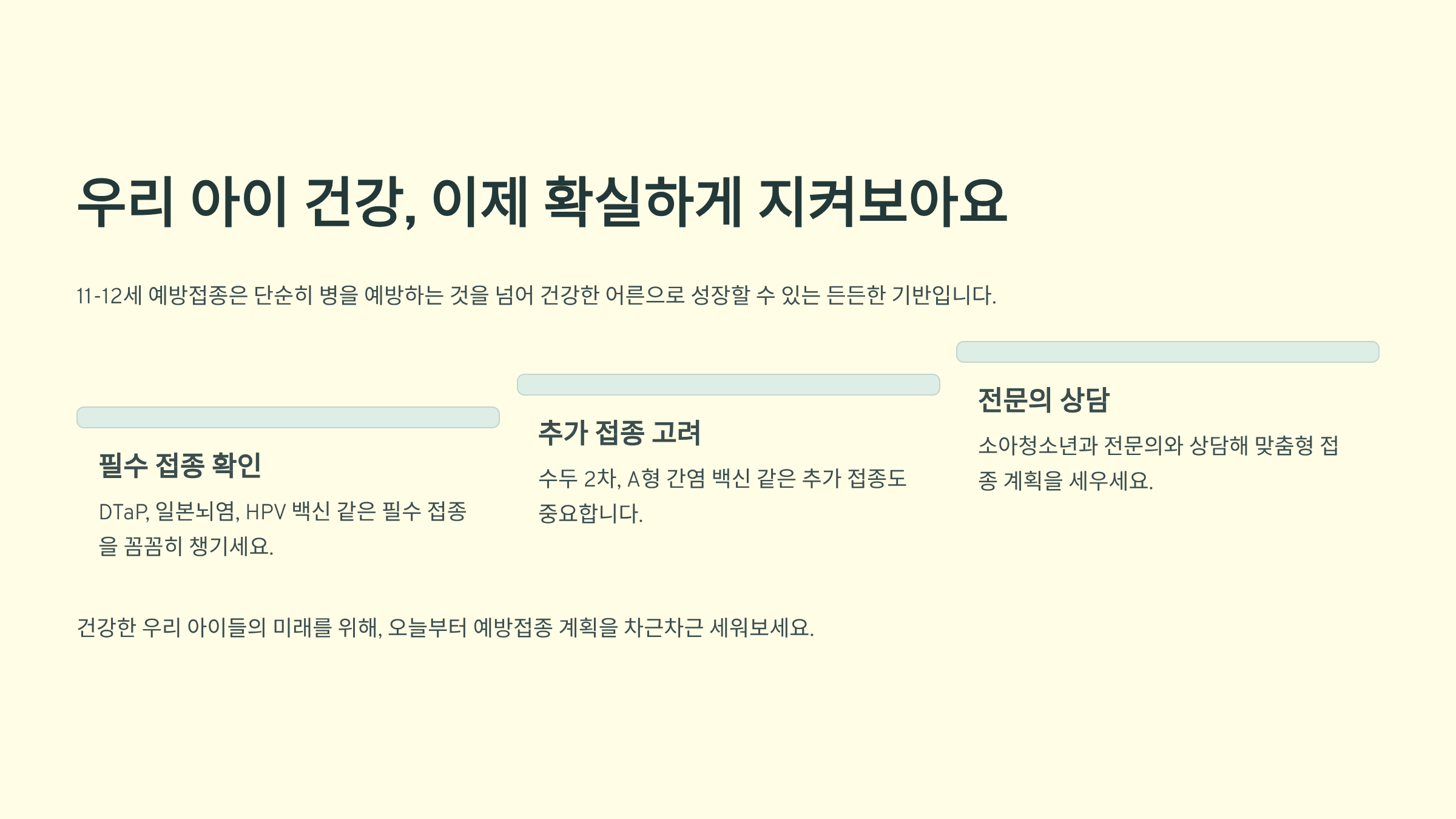 11-12세 예방접종은 단순히 병을 예방하는 것을 넘어서, 우리 아이가 건강한 어른으로 성장할 수 있는 든든한 기반을 만들어주는 일이에요.