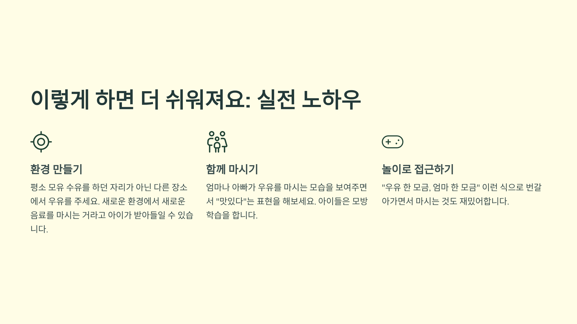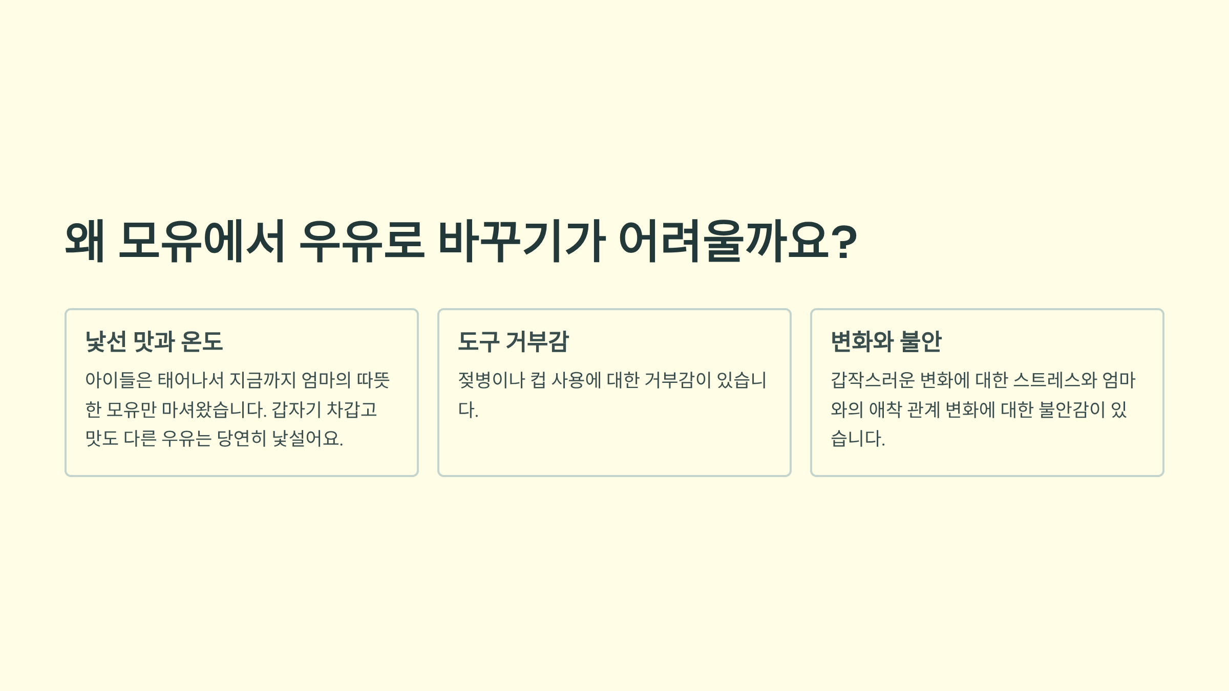 아이들은 태어나서 지금까지 엄마의 따뜻한 모유만 마셔왔는데, 갑자기 차갑고 맛도 다른 우유를 주면 당연히 낯설어할 수밖에 없어요. 마치 우리가 평생 먹던 집밥을 갑자기 다른 나라 음식으로 바꾸라고 하면 적응하기 어려운 것과 비슷한 거죠.