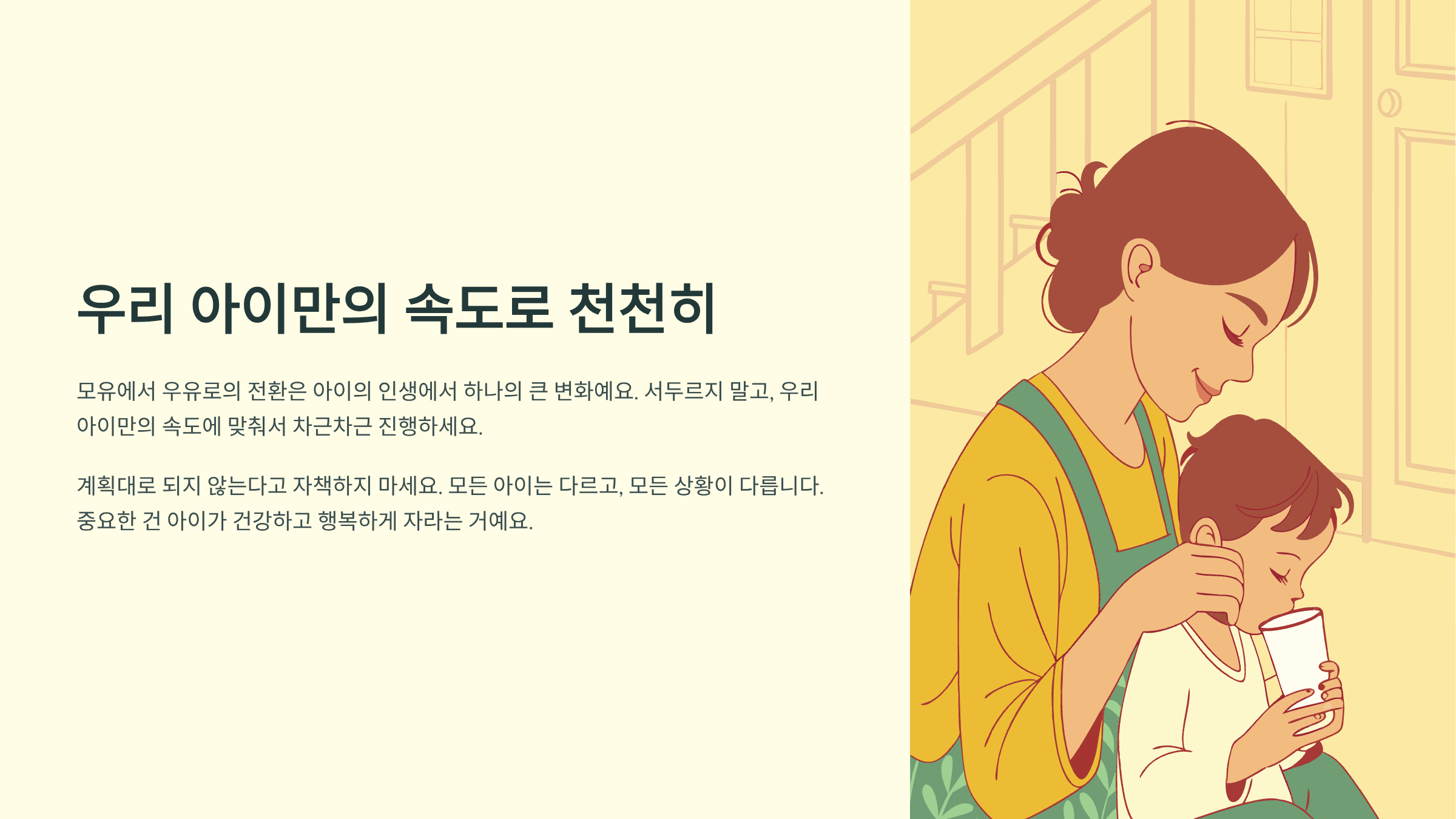 모유에서 우유로의 전환은 아이의 인생에서 하나의 큰 변화예요. 엄마에게도 마찬가지고요. 그러니까 서두르지 말고, 우리 아이만의 속도에 맞춰서 차근차근 진행하면 돼요.