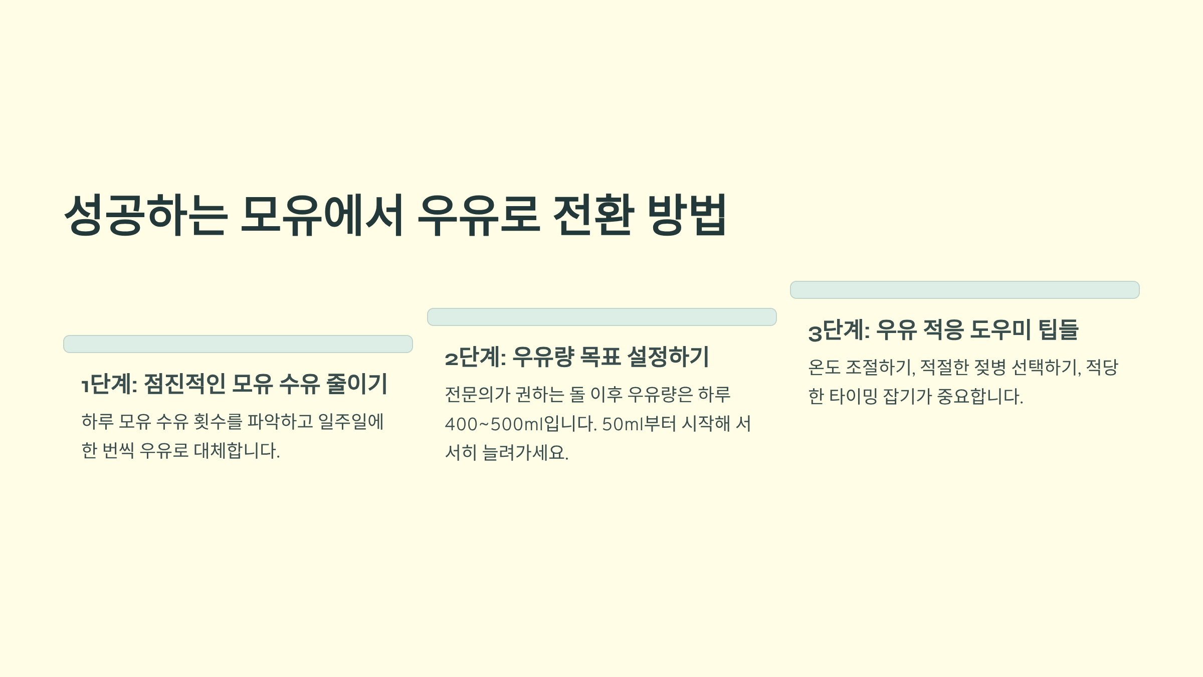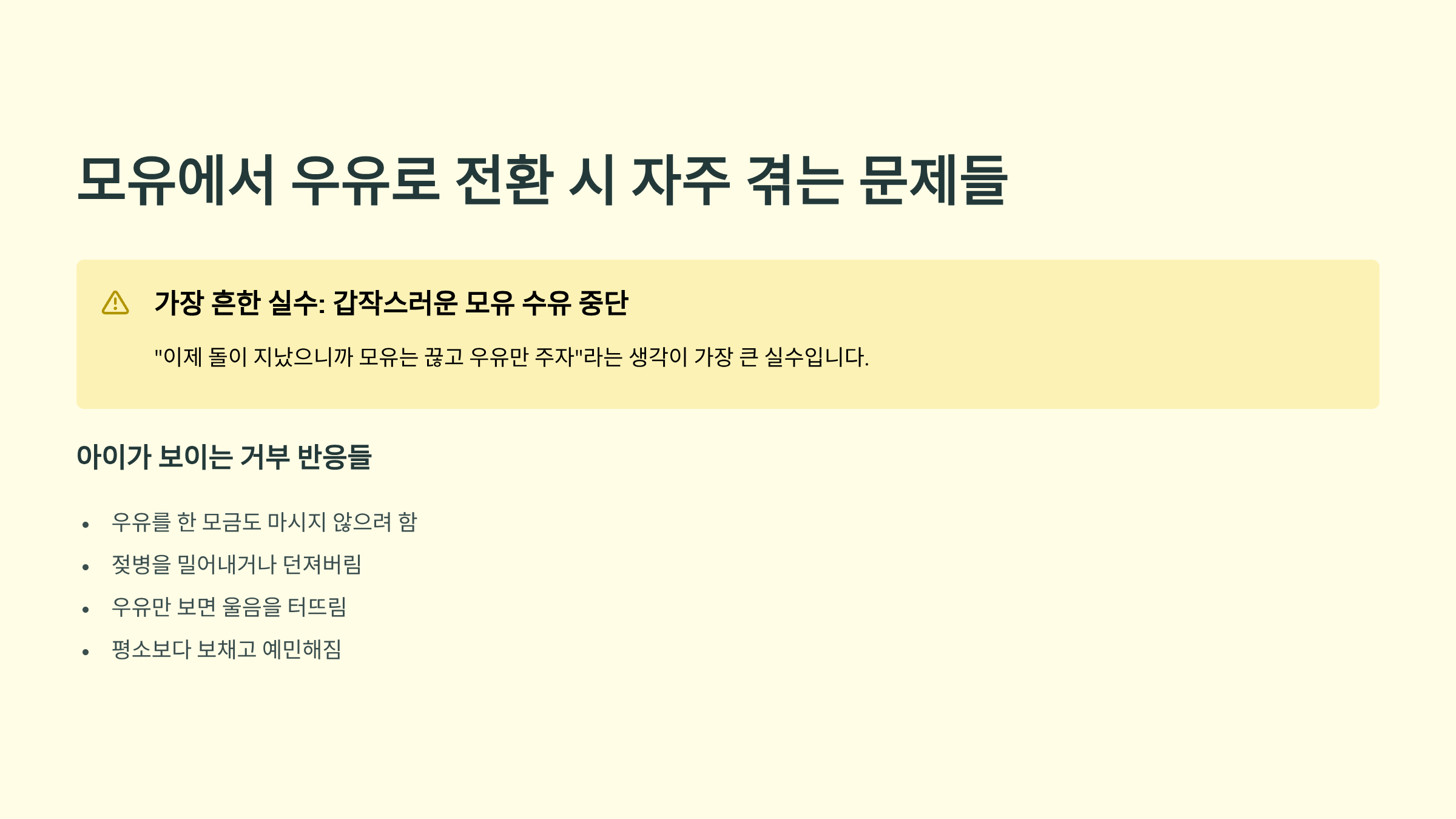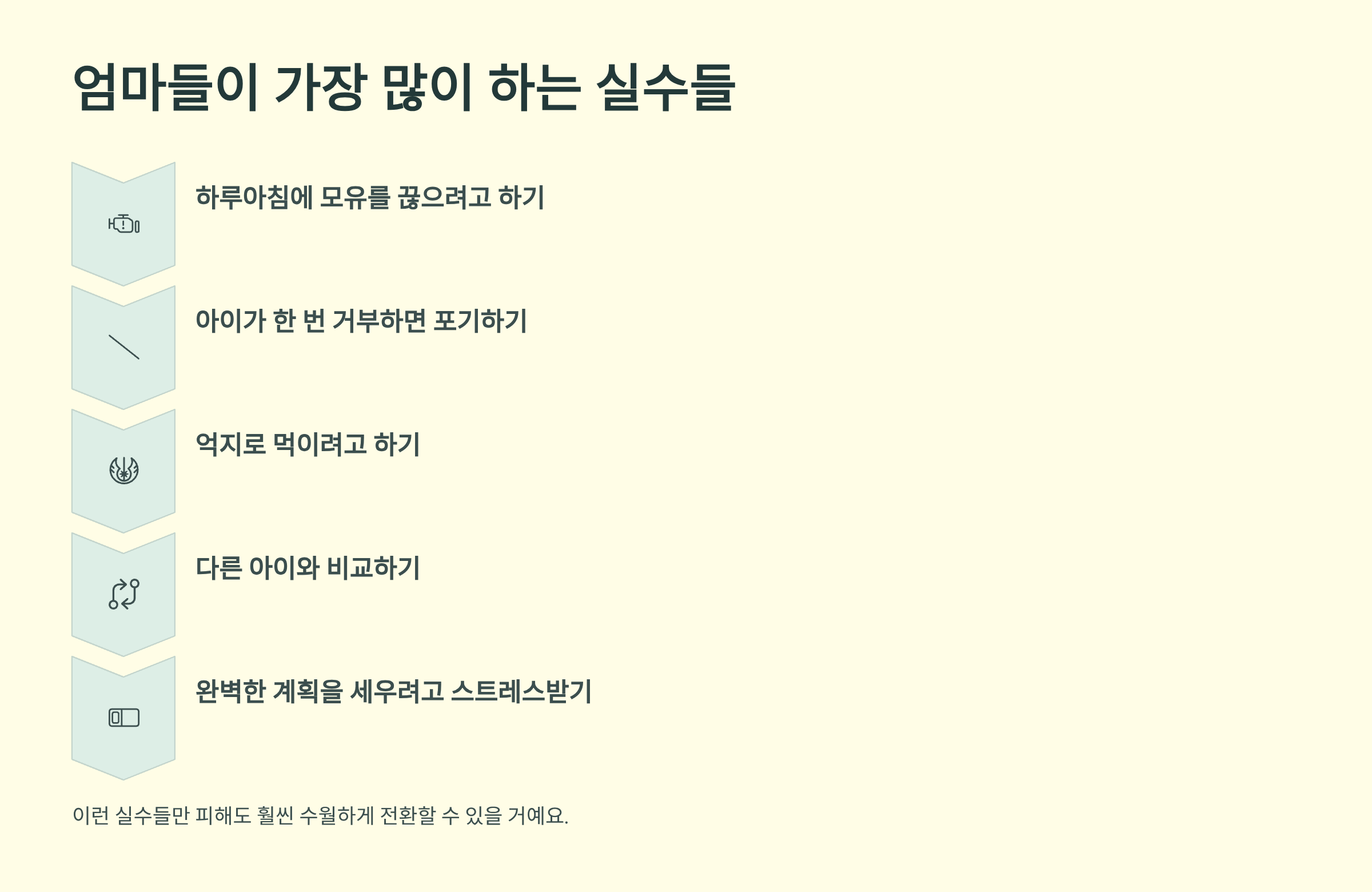많은 분들이 "이제 돌이 지났으니까 모유는 끊고 우유만 주자"라고 생각하시는데, 이게 바로 가장 큰 실수예요. 모유 우유 전환 실패의 가장 큰 원인이 바로 이런 급작스러운 변화거든요.