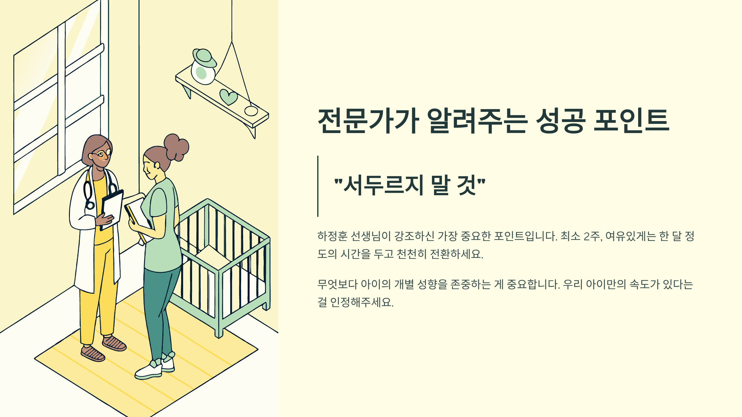 하정훈 선생님이 강조하신 가장 중요한 포인트는 **"서두르지 말 것"**이에요. 최소 2주, 여유있게는 한 달 정도의 시간을 두고 천천히 전환하라고 하셨거든요.