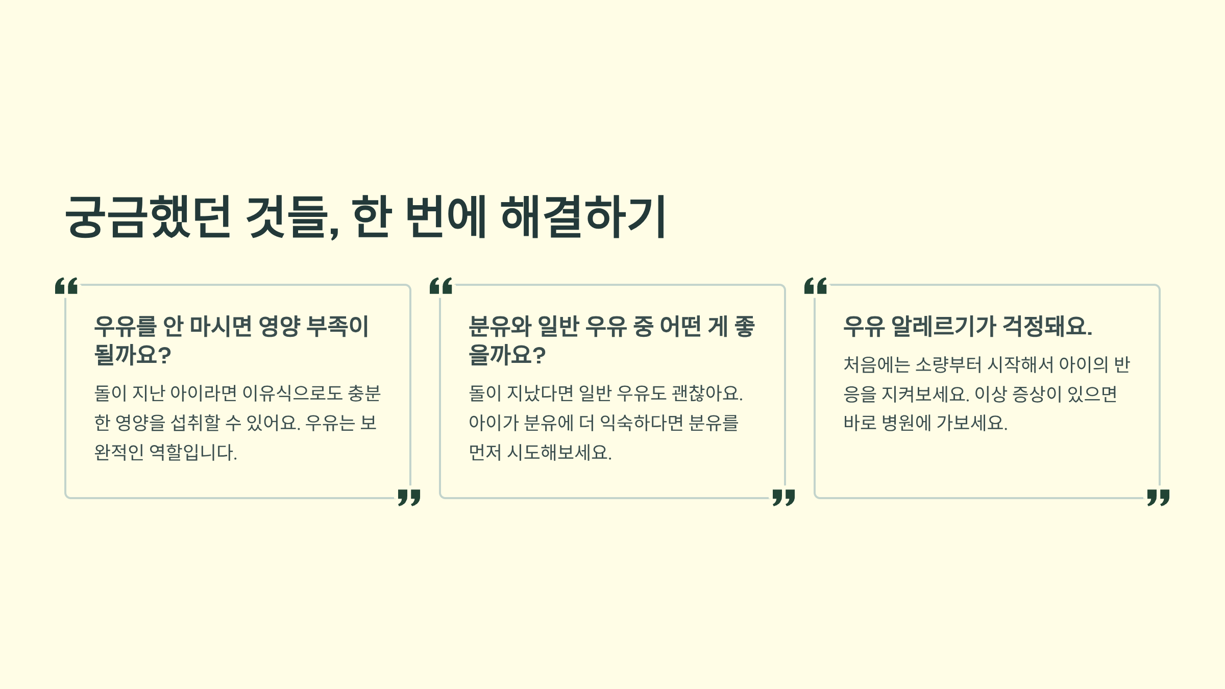 Q: 우유를 안 마시면 영양 부족이 될까요? A: 돌이 지난 아이라면 이유식으로도 충분한 영양을 섭취할 수 있어요. 우유는 보완적인 역할이니까 너무 스트레스받지 마세요.