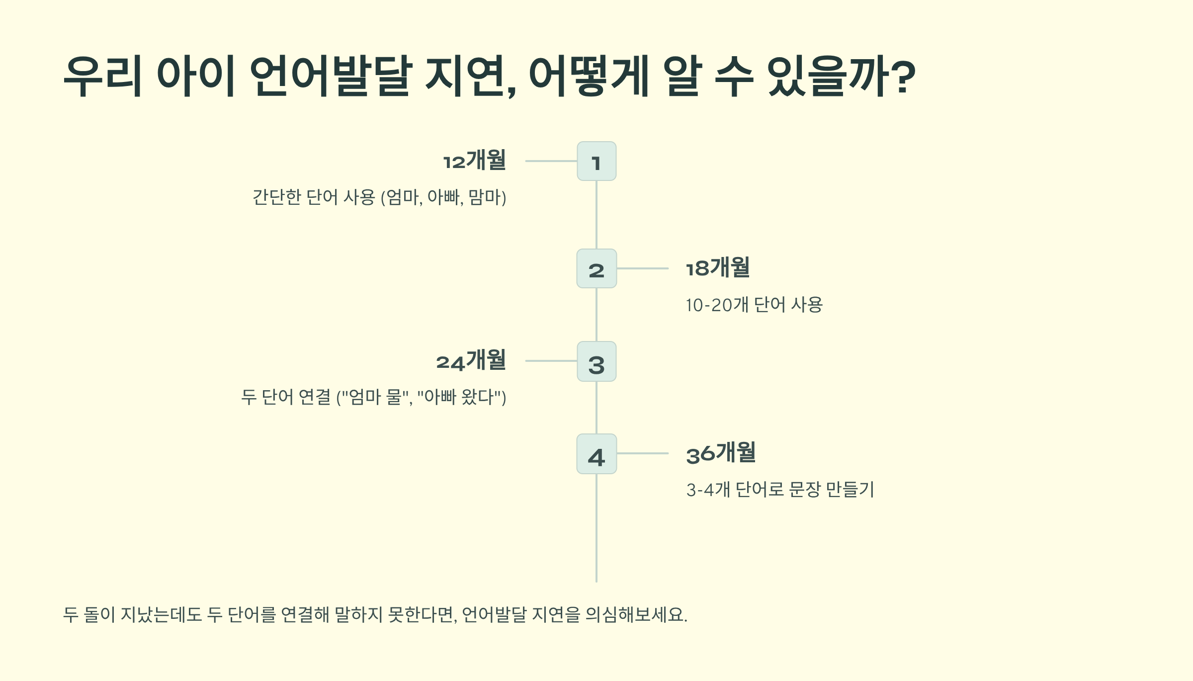 12개월경: 간단한 단어 (엄마, 아빠, 맘마 등) 18개월경: 10-20개 단어 사용 24개월경: 두 단어 연결해서 말하기 ("엄마 물", "아빠 왔다" 등) 36개월경: 3-4개 단어로 문장 만들기