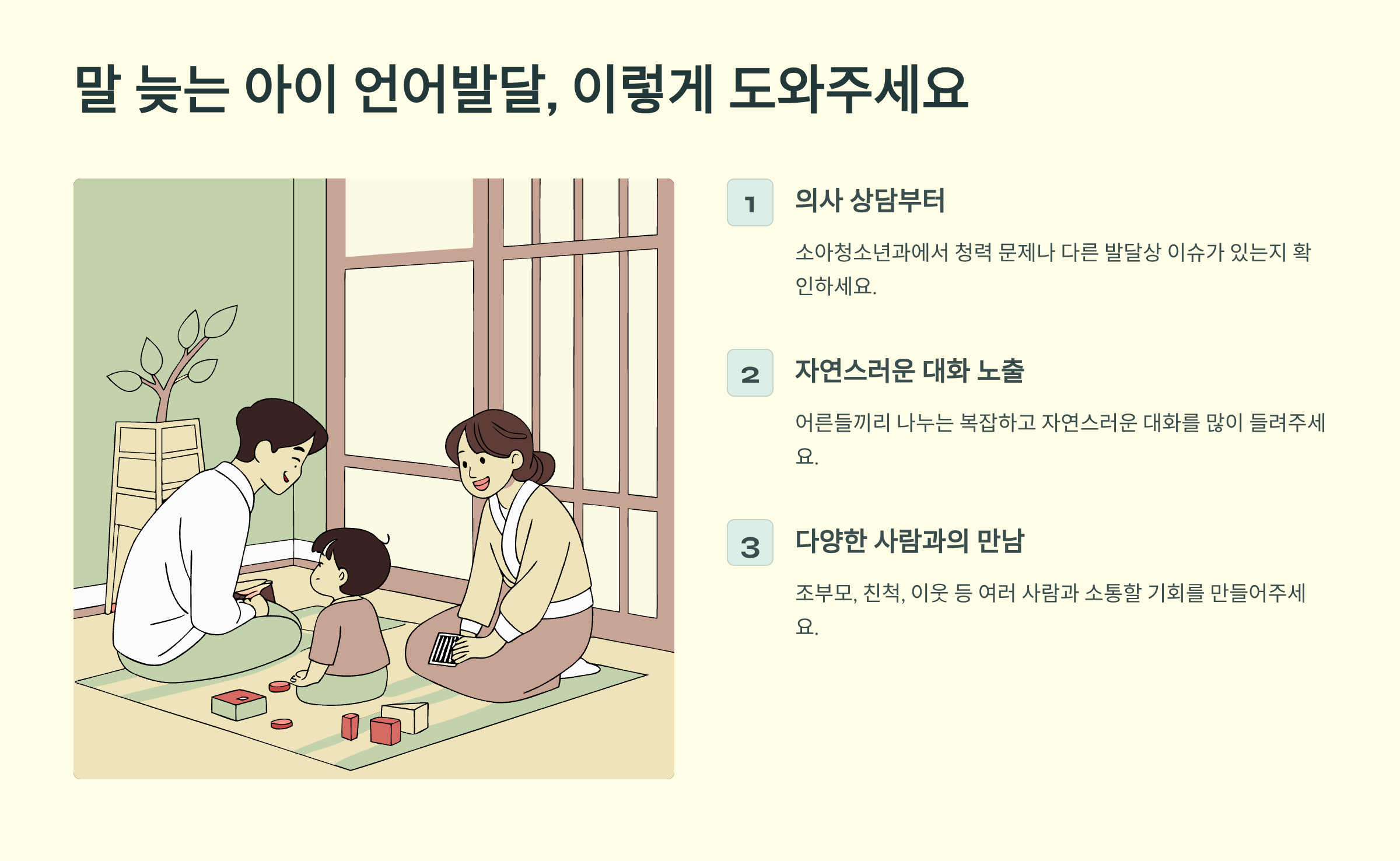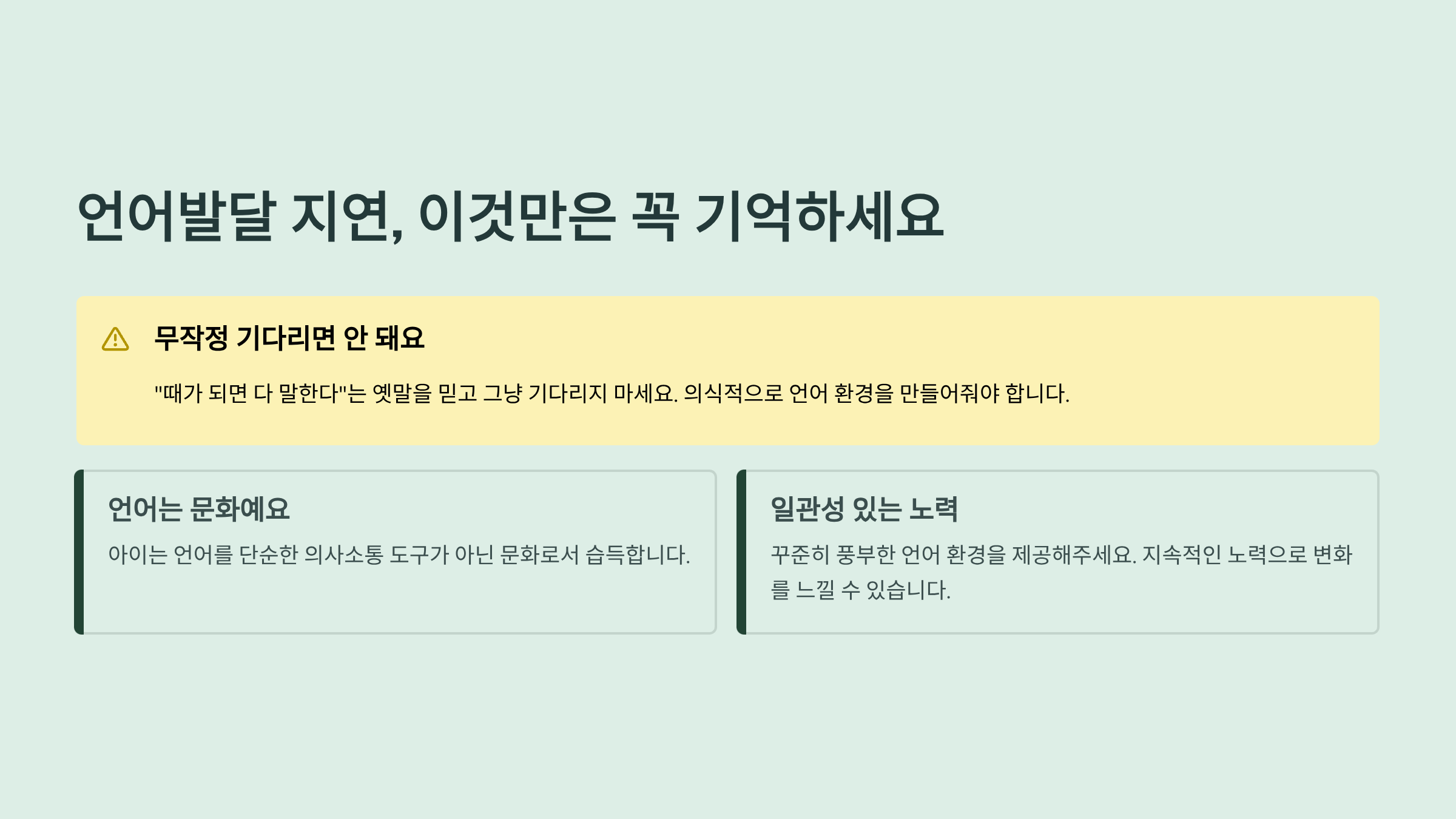 "때가 되면 다 말한다"는 옛말을 믿고 그냥 기다리시면 안 돼요. 과거와 달리 요즘은 자연스러운 언어 노출이 부족한 환경이라서, 부모가 의식적으로 언어 환경을 만들어줘야 해요.