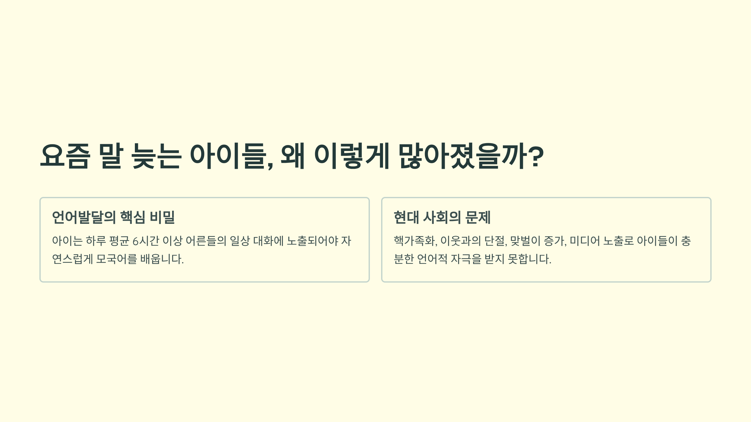 결국 아이들이 충분한 언어적 자극을 받지 못해서 언어발달이 지연되는 거예요. 이게 바로 요즘 말 늦는 아이들이 많아진 진짜 이유랍니다.