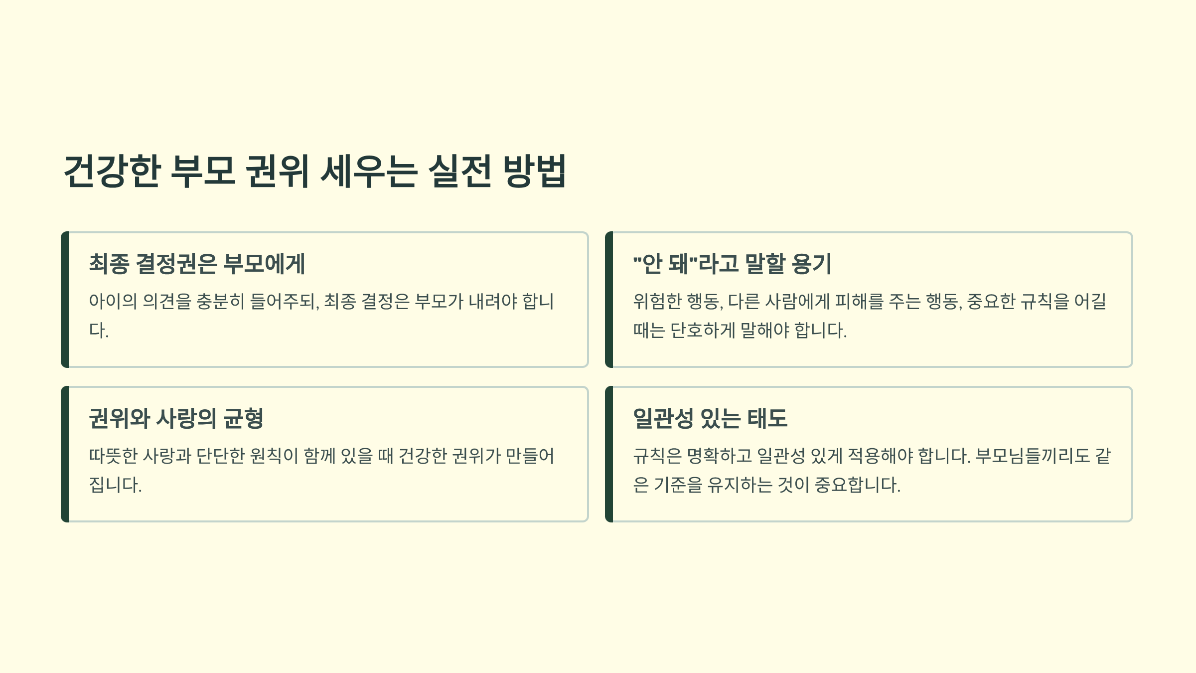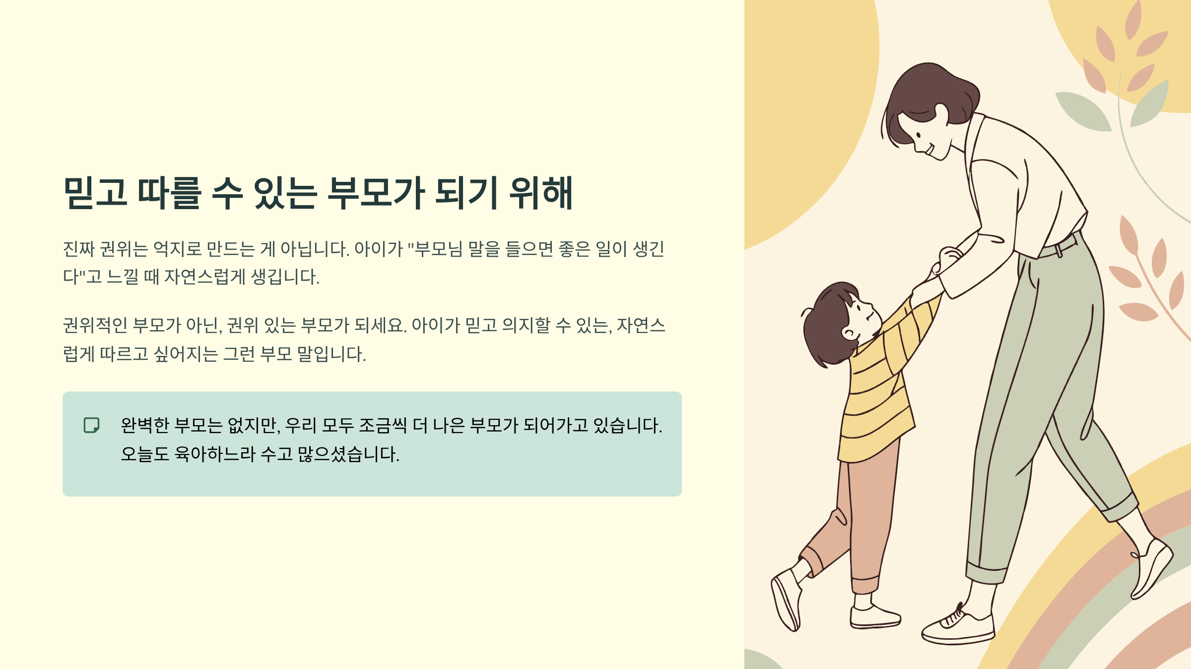 결국 진짜 권위는 억지로 만드는 게 아니에요. 아이가 "엄마 아빠 말을 들으면 좋은 일이 생긴다", "우리 부모님은 나를 정말 사랑하고 나를 위해 최선을 다한다"고 느낄 때 자연스럽게 생기는 거죠.