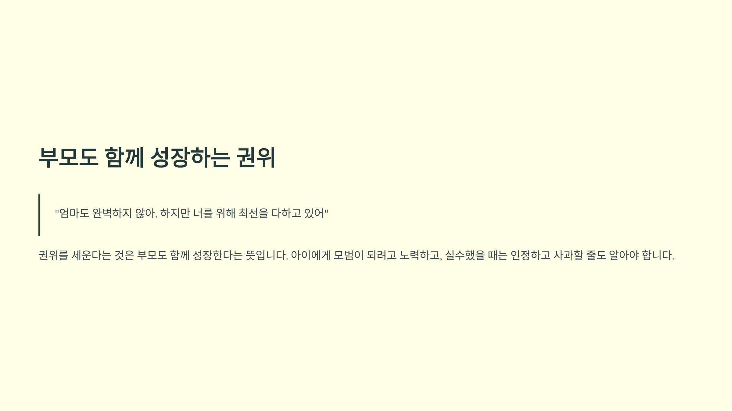 권위적인 부모가 되라는 게 아니라, 권위 있는 부모가 되라는 거예요. 아이가 믿고 의지할 수 있는, 그래서 자연스럽게 따르고 싶어지는 그런 부모 말이에요.