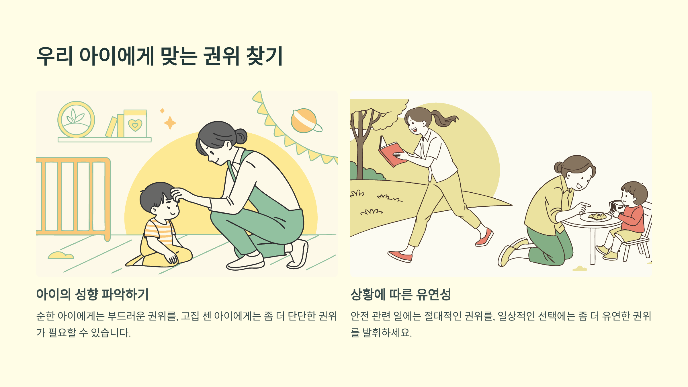 순한 아이에게는 부드러운 권위를, 고집 센 아이에게는 좀 더 단단한 권위가 필요할 수 있어요. 아이마다 다르니까 우리 아이를 잘 관찰해보세요.