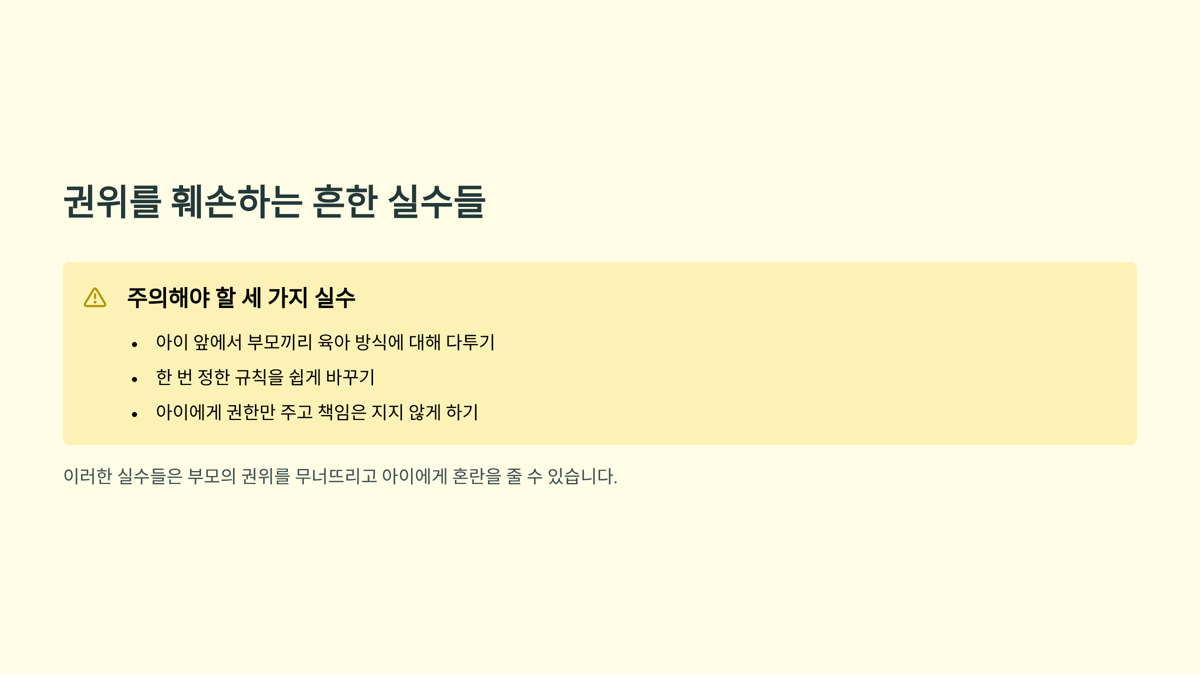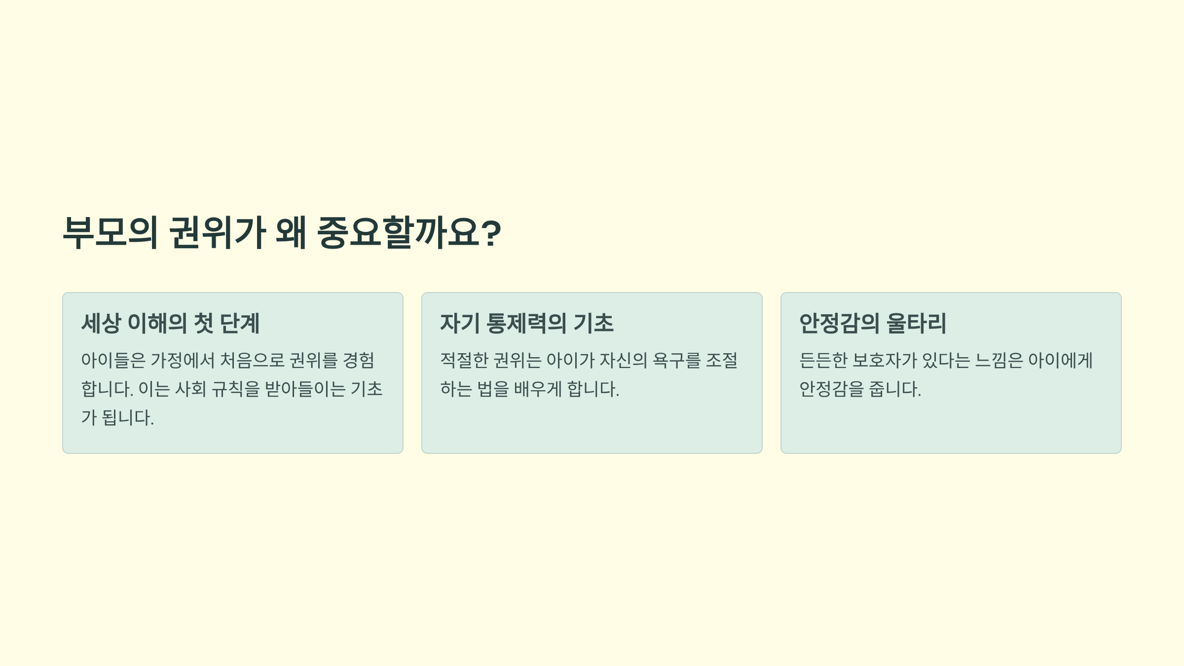 많은 부모님들이 이런 걱정을 하시는데요, 실제로는 그렇지 않아요. 적절한 권위는 오히려 아이에게 안전한 경계선을 제공해줘요. 아이들은 우리가 생각하는 것보다 훨씬 강하고 회복력이 좋거든요.