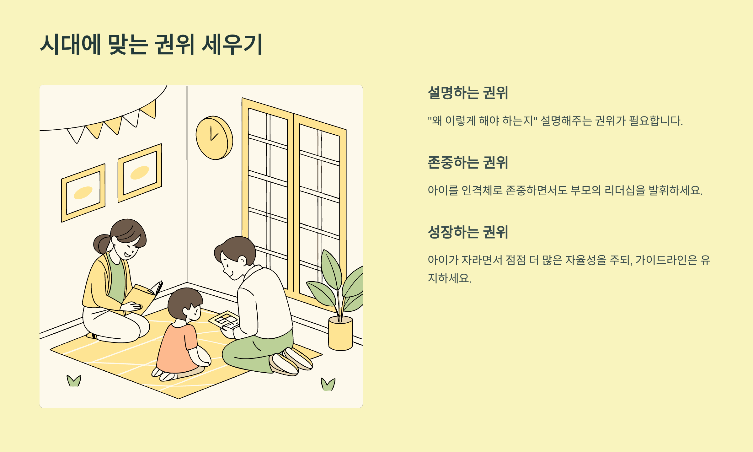 예전처럼 "어른 말을 무조건 들어야 해"가 아니라, "왜 이렇게 해야 하는지" 설명해주는 권위가 필요해요. 아이들도 납득할 수 있는 이유가 있으면 더 잘 따라와요.