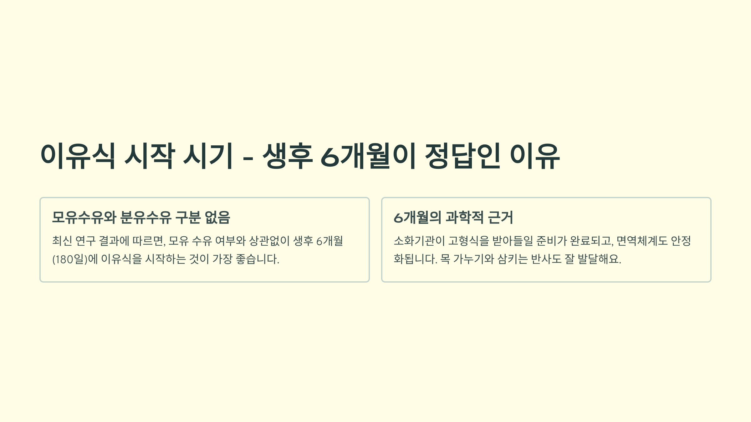 예전에는 모유를 먹는 아기는 6개월, 분유를 먹는 아기는 4~6개월에 이유식을 시작하라고 했죠. 하지만 최신 연구 결과에 따르면, **모유 수유 여부와 상관없이 생후 6개월(180일)**에 이유식을 시작하는 것이 아기에게 가장 좋다고 밝혀졌어요.