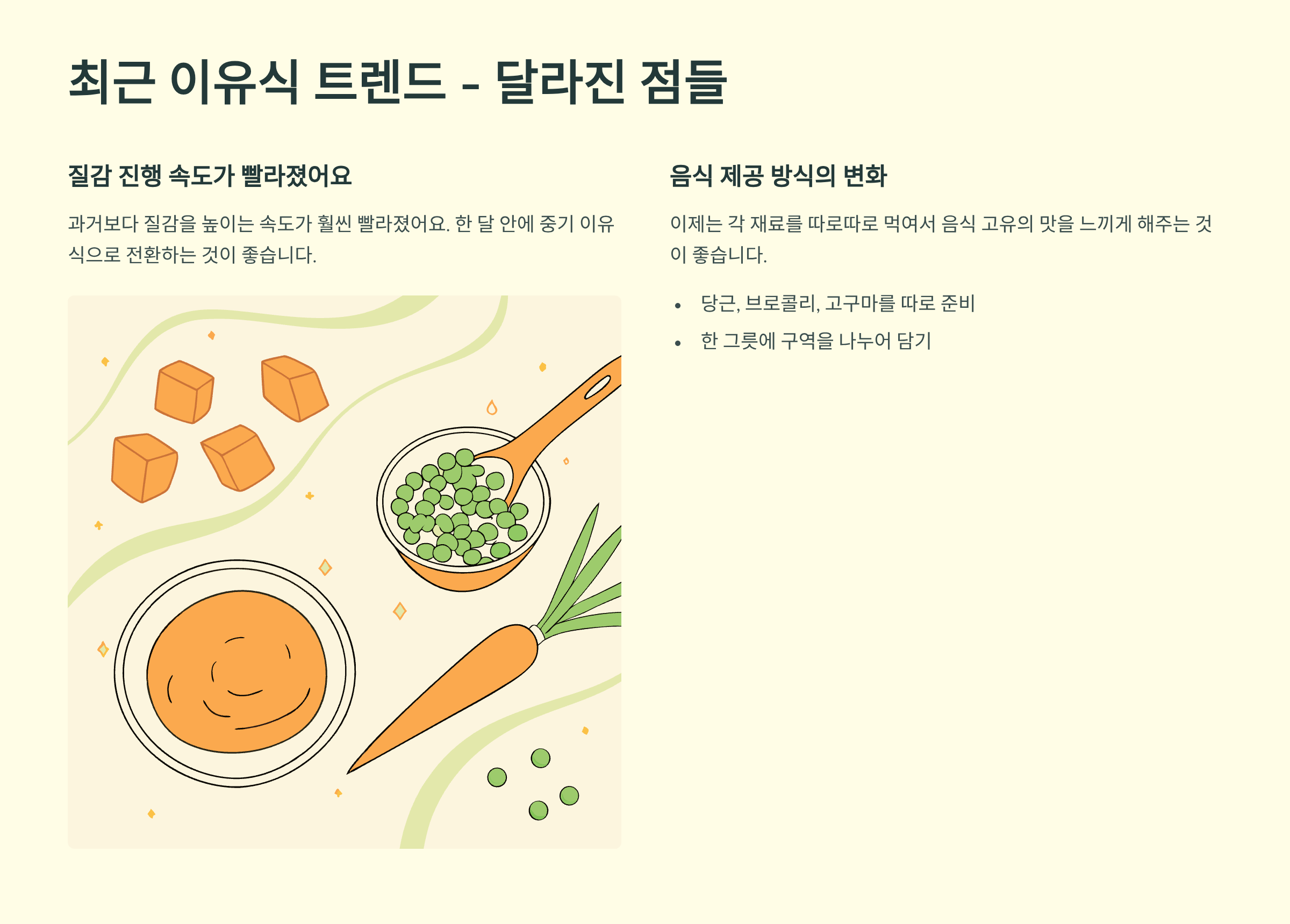 최근 이유식 트렌드가 많이 바뀌었다는 거 알고 계셨나요? 예전에 우리 엄마들이 해주셨던 방식과는 꽤 다른 부분들이 있어서, 처음 이유식을 시작하는 엄마들이 헷갈려하시는 경우가 많더라고요.