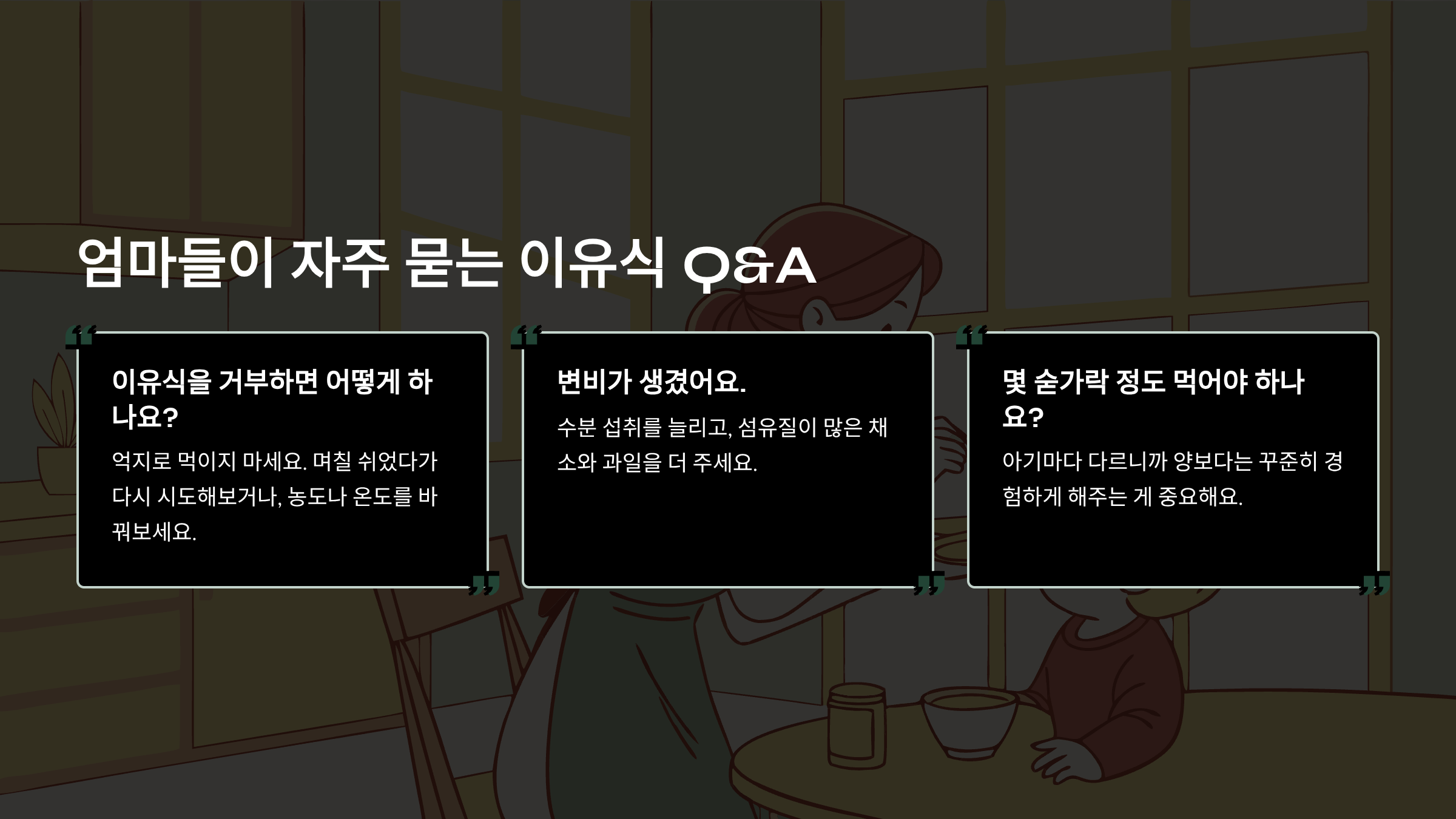 Q: 이유식을 거부하면 어떻게 하나요? A: 억지로 먹이지 마세요. 며칠 쉬었다가 다시 시도해보거나, 농도나 온도를 바꿔보세요.