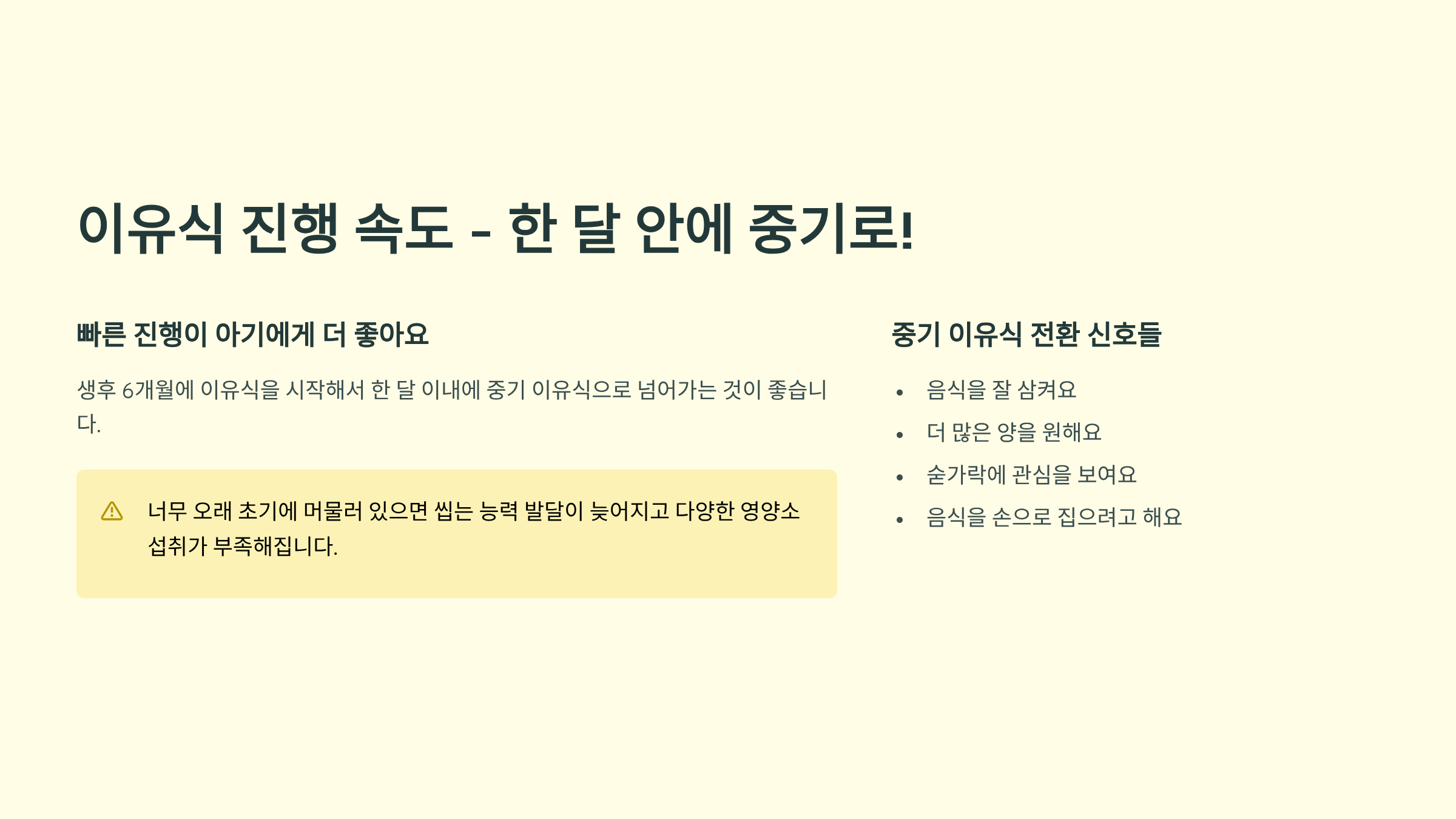 생후 6개월에 이유식을 시작해서 한 달 이내에 중기 이유식으로 넘어가는 것이 좋아요. 너무 오래 초기에 머물러 있으면: