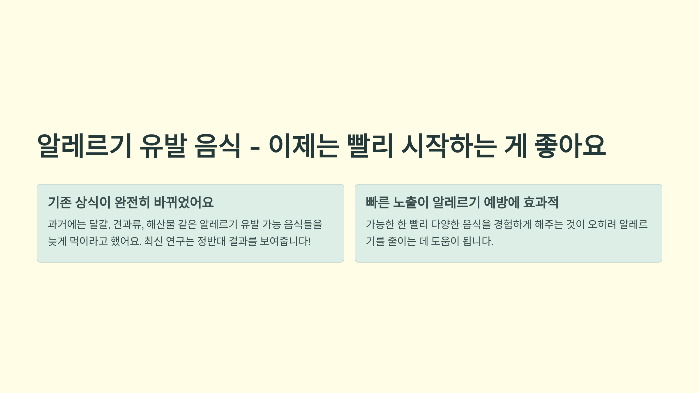 과거에는 달걀, 견과류, 해산물 같은 알레르기 유발 가능 음식들을 늦게 먹이라고 했어요. 하지만 최신 연구에서는 정반대 결과가 나왔어요!