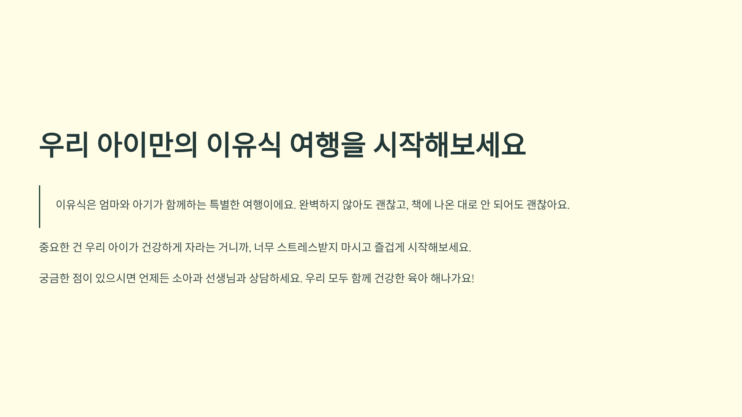 이유식은 엄마와 아기가 함께하는 특별한 여행이에요. 완벽하지 않아도 괜찮고, 책에 나온 대로 안 되어도 괜찮아요.