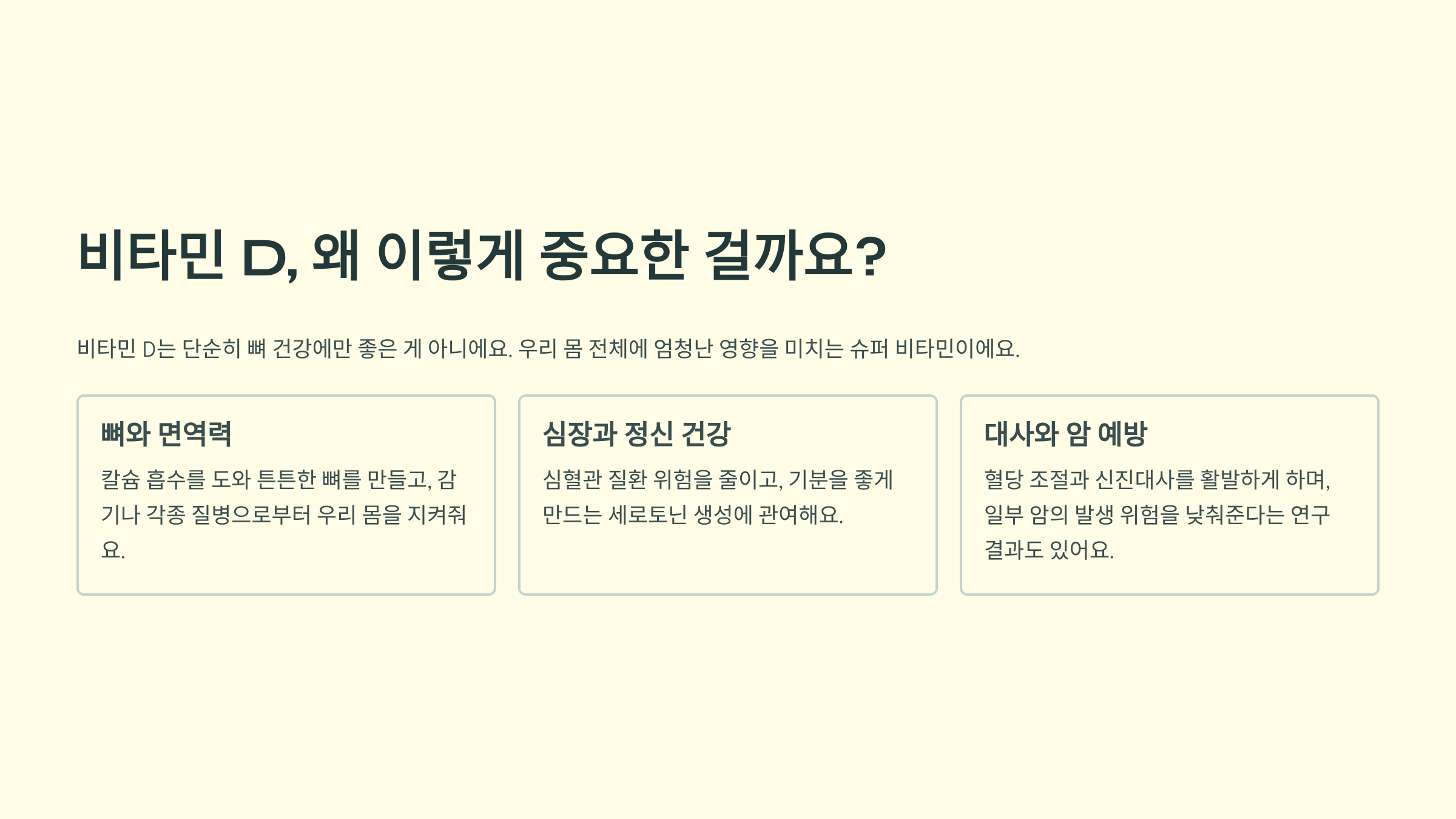 비타민 D는 단순히 뼈 건강에만 좋은 게 아니에요. 우리 몸 전체에 엄청난 영향을 미치는 슈퍼 비타민이라고 할 수 있죠.