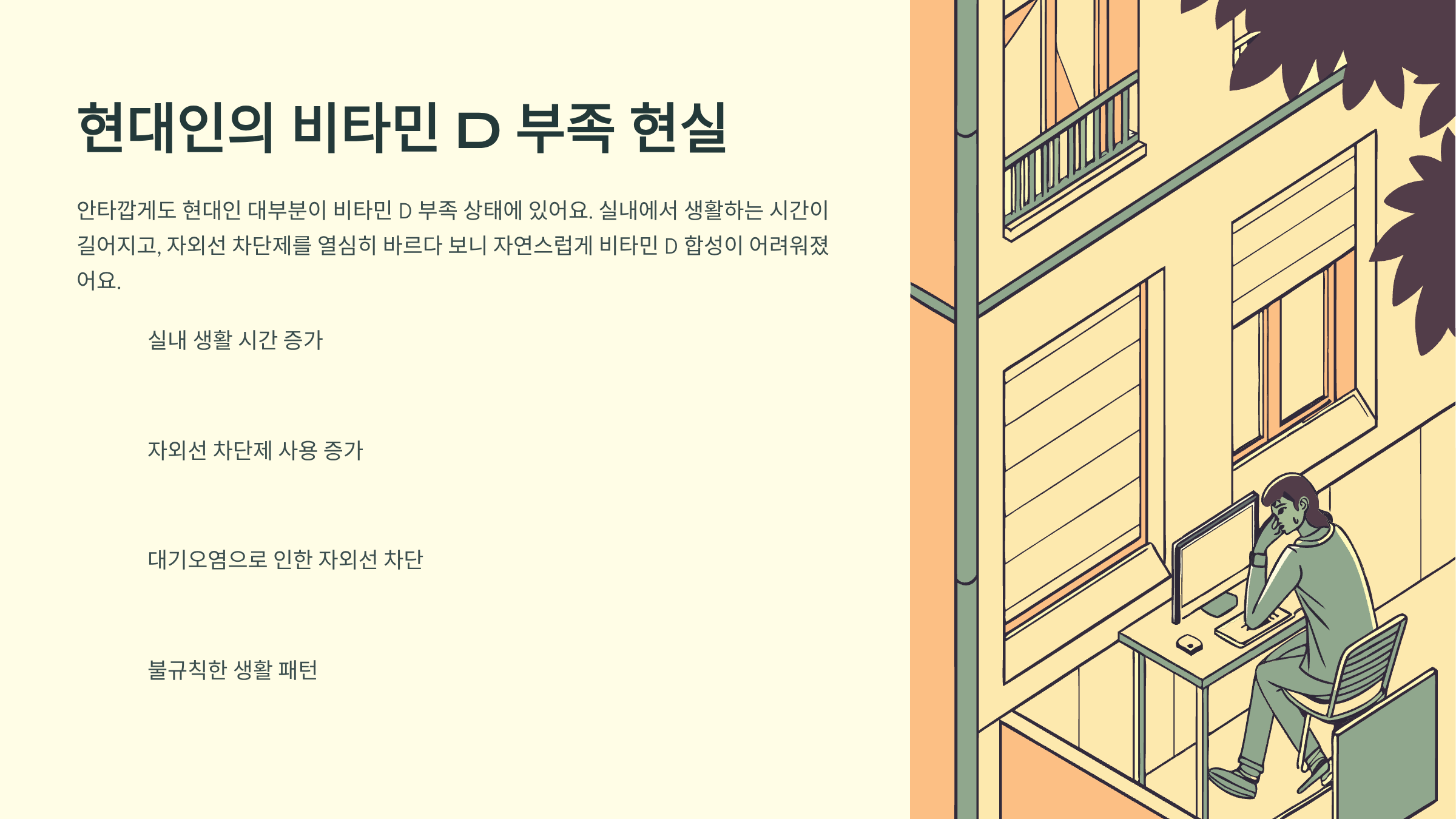 안타깝게도 현대인 대부분이 비타민 D 부족 상태에 있어요. 실내에서 생활하는 시간이 길어지고, 자외선 차단제를 열심히 바르다 보니 자연스럽게 비타민 D 합성이 어려워진 거죠.