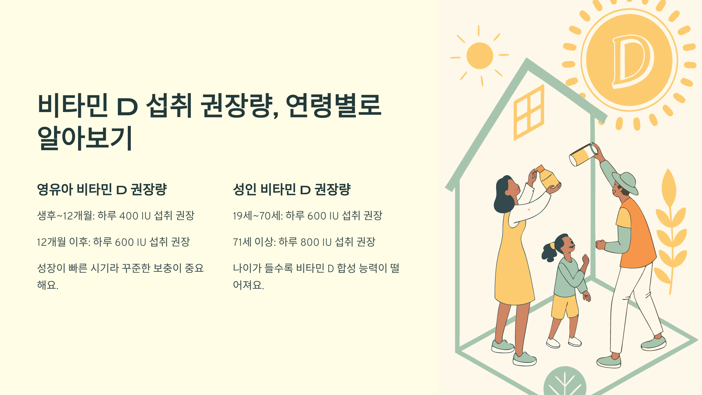 비타민 D 섭취량은 연령에 따라 달라요. 특히 성장기 아이들과 임산부, 노인분들은 더욱 신경 써야 해요.