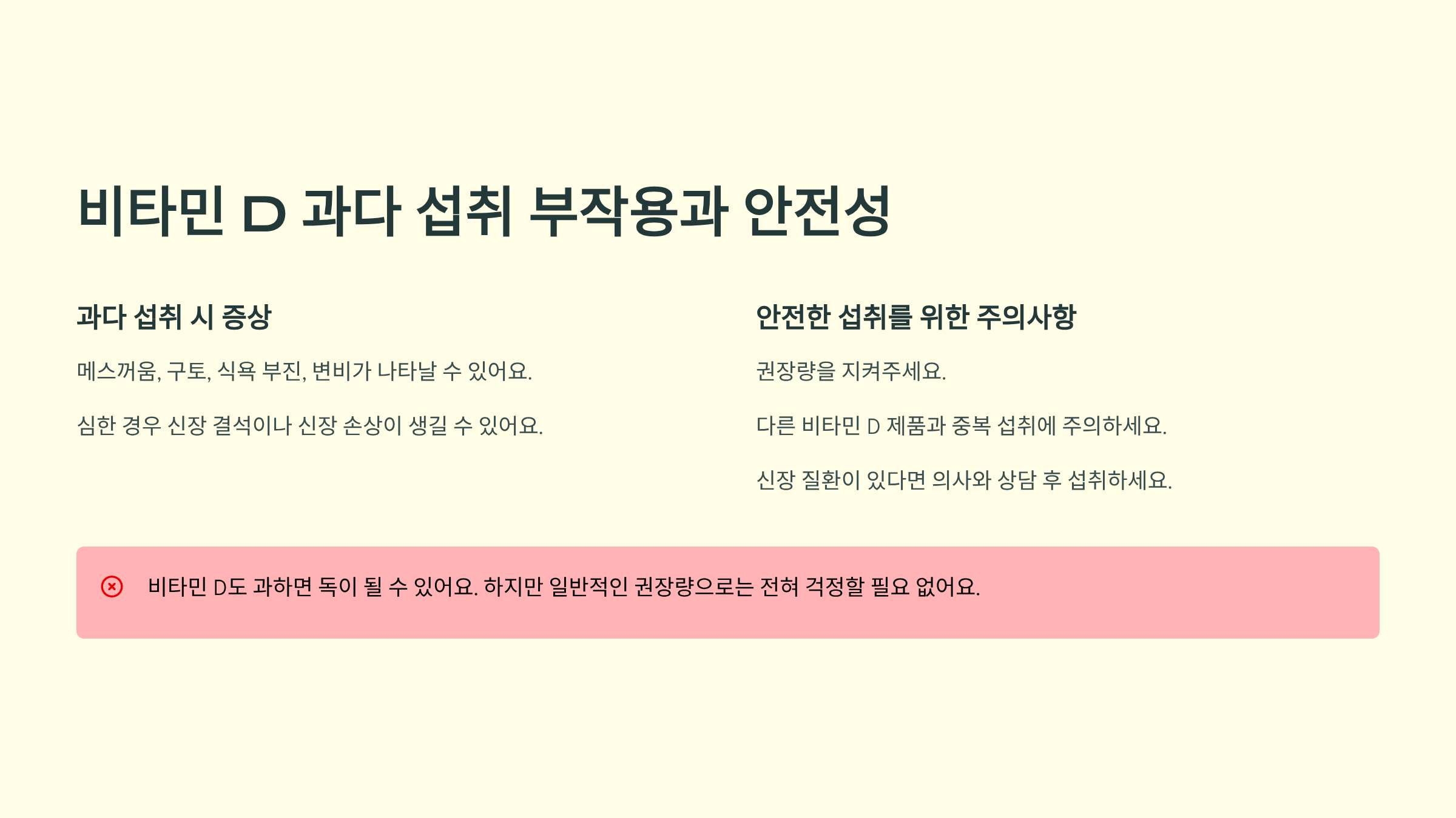 비타민 D도 과하면 독이 될 수 있어요. 하지만 일반적인 권장량으로는 전혀 걱정할 필요 없어요.