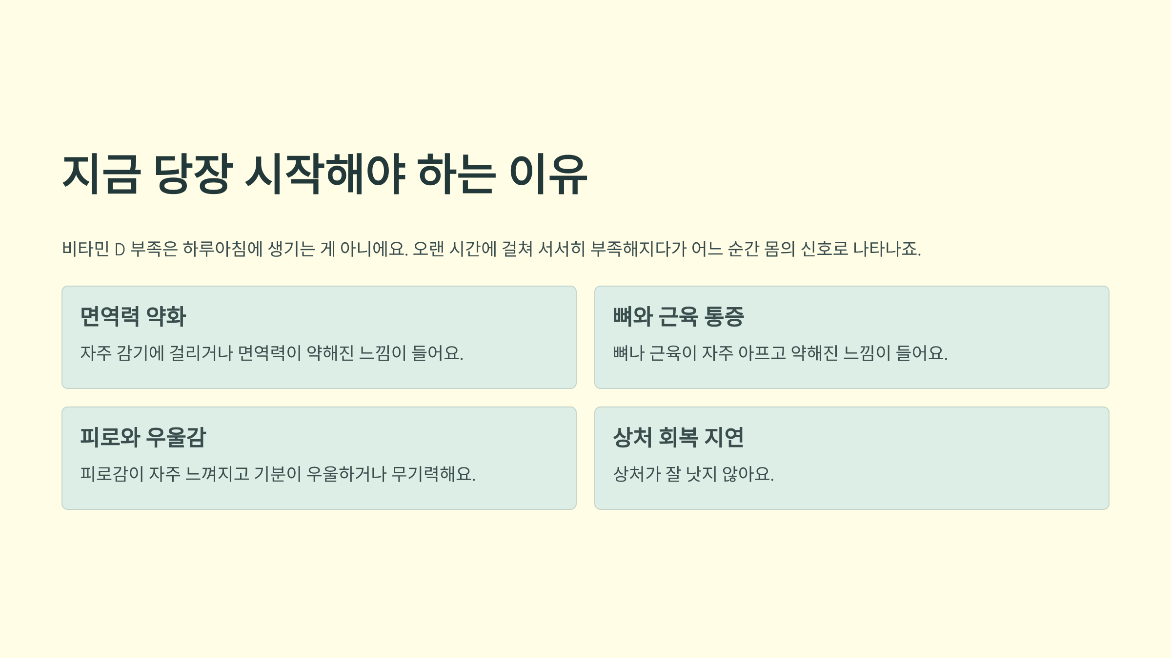 비타민 D 부족은 하루아침에 생기는 게 아니에요. 오랜 시간에 걸쳐 서서히 부족해지다가 어느 순간 몸의 신호로 나타나죠.