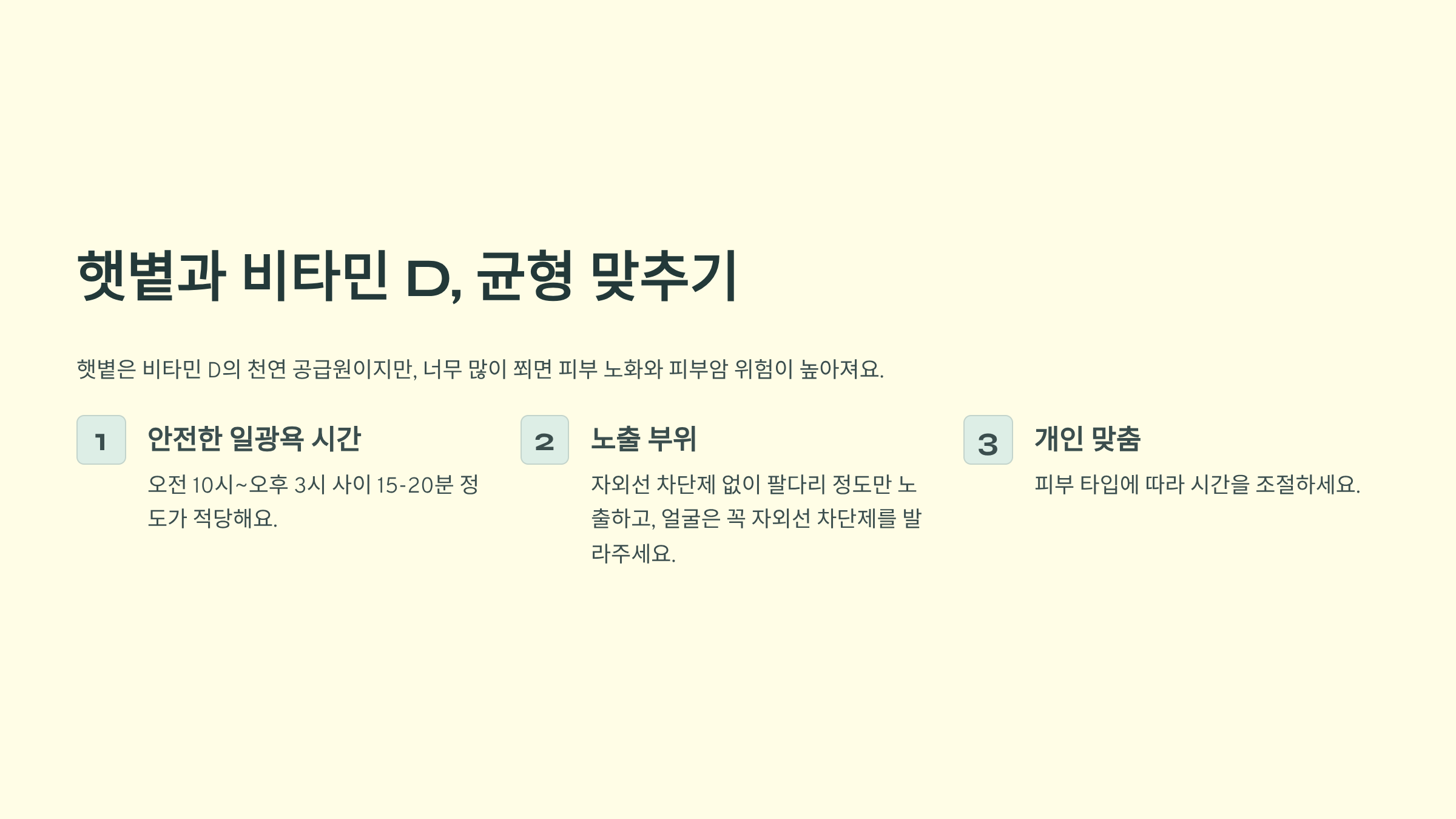 햇볕은 비타민 D의 천연 공급원이지만, 너무 많이 쬐면 피부 노화와 피부암 위험이 높아져요.
