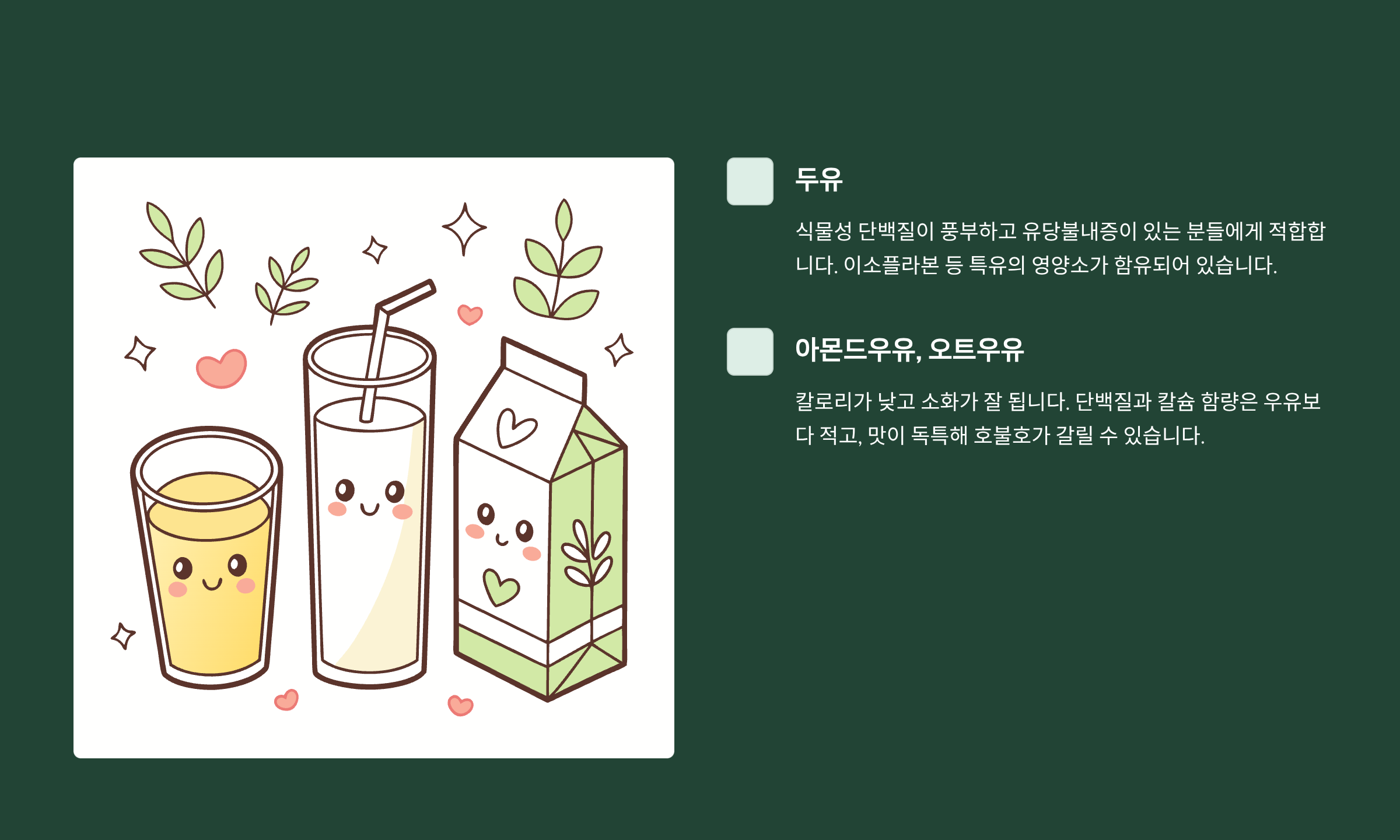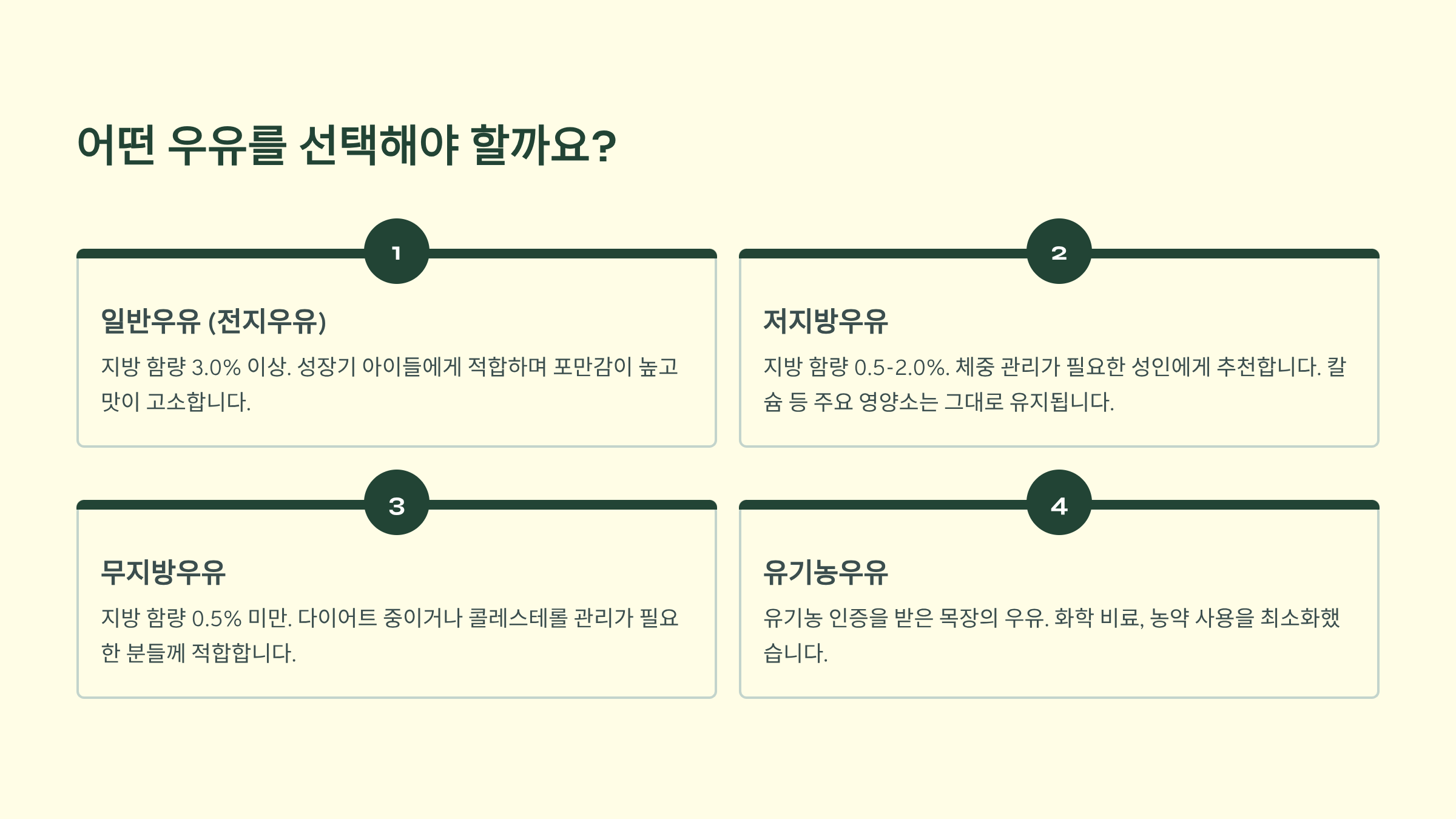 물론 개인의 건강 상태나 선호도에 따라 선택은 달라질 수 있어요. 유당불내증이 있다면 대안을 찾아야 하고, 칼로리 관리가 필요하다면 저지방 제품을 선택하면 되죠.