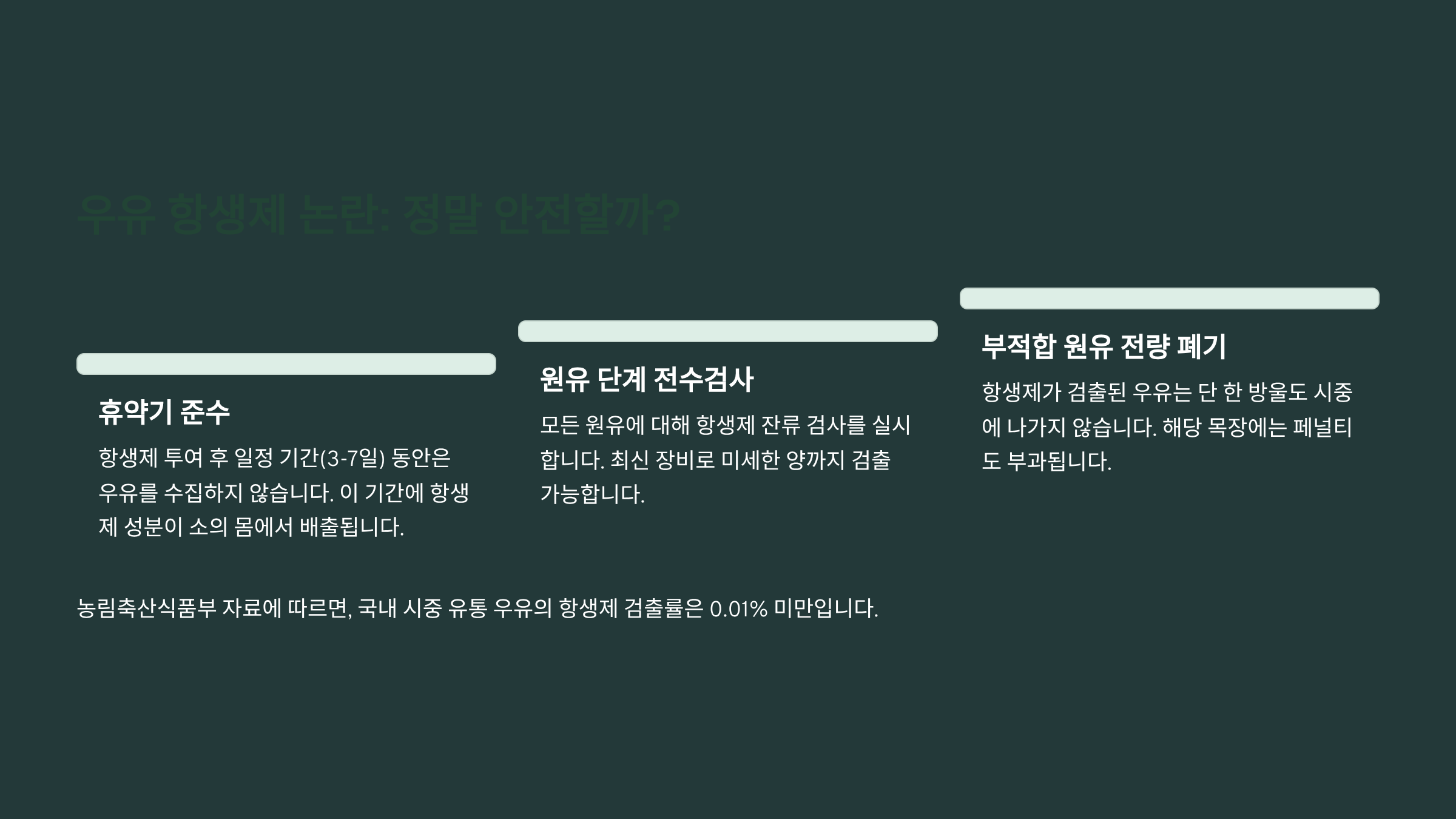 - 모든 원유에 대해 항생제 잔류 검사를 실시해요